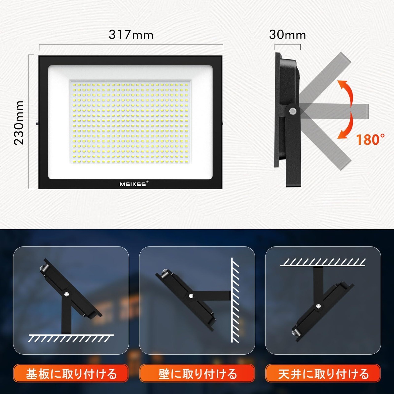 【高輝度・省エネ】:MEIKEEのLED投光器は広面積・高光効なSMDチップを実装することで、200Wで全光束20000LMに達します、驚くさの明るさを実現しました!抜群の省電力化が可能低電力で使い勝手が良くそこそこ明るいのが良いところです。200Wの光源、6500K、20000lm、今までの投光器に比べて取り扱いにも良く消費電力の割には十分明るいです。