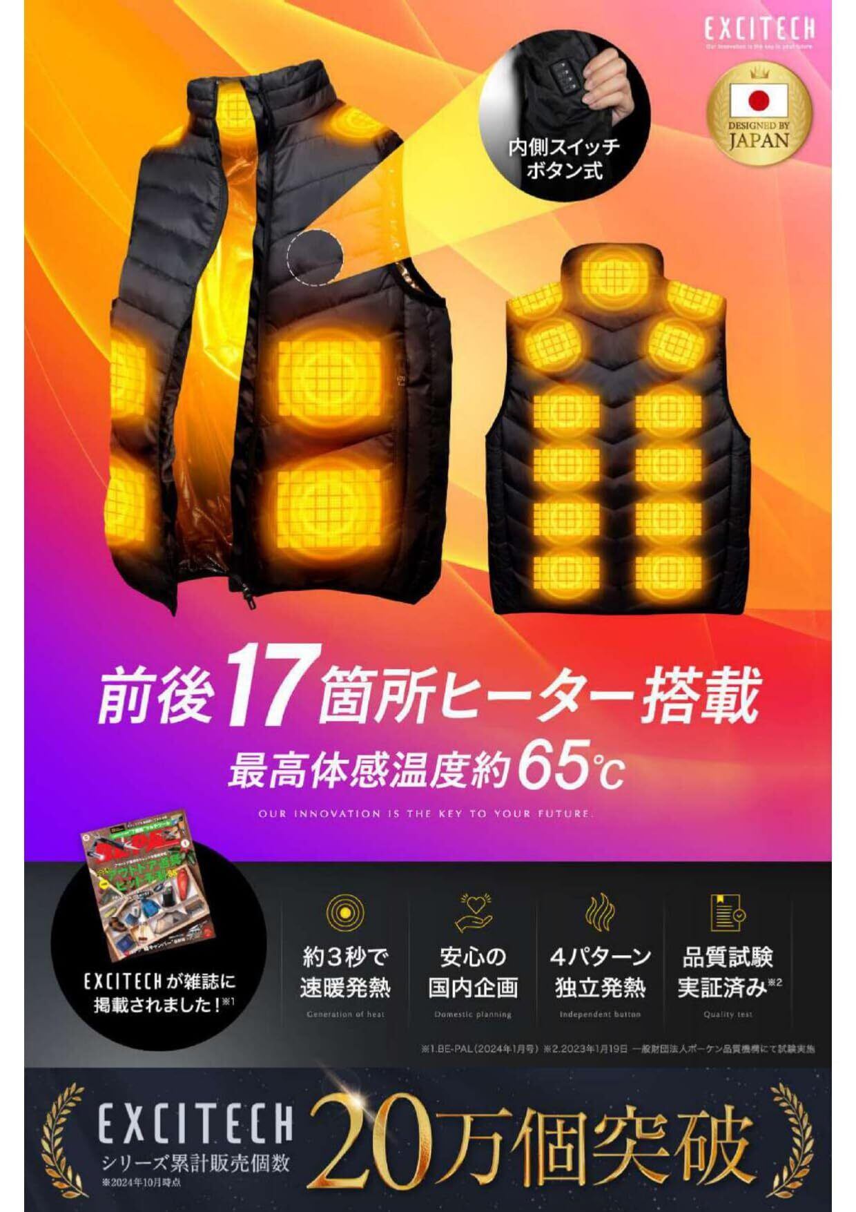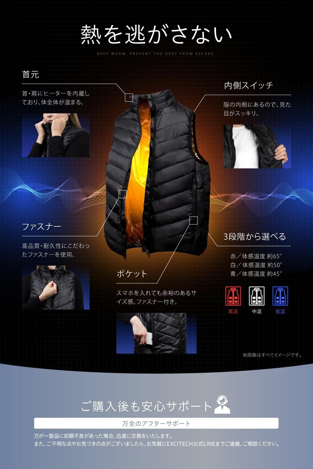 【新春セール】[Excitech] 国内メーカー 電熱ベスト 加熱ベスト ヒーターベスト【前後17箇所発熱 4箇所独立スイッチ】 USB給電 3段階温度調整 速暖 洗濯可 メンズ アクティブベスト 男女兼用 プレゼント (M L XL 2XL 3XL 4XL) | ニコニコSHOP
