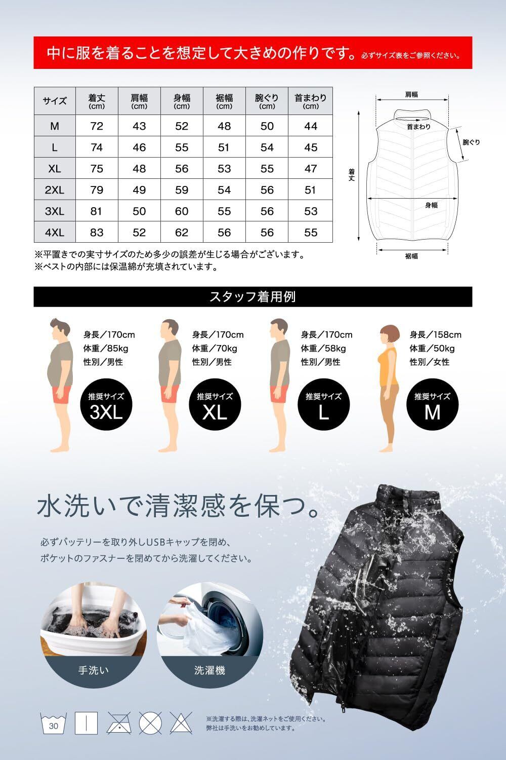 Mサイズ️画像のサイズ表をご参考に、サイズをお選びください。 【素材構成】表・裏地・中綿 : ポリエステル100% ※本製品にはモバイルバッテリーとACアダプターは付属しておりません。※お手持ちのバッテリーを使用する際は、必ず『USB出力:5V⎓4.5A / 5V⎓3A / 9V⎓2A / 12V⎓1.5A』に"全てに"対応しているバッテリーをご使用ください。※規格内のバッテリーであってもUSBケーブルが奥まで差し込まれていない場合、接続不良が原因で温まらない可能性がございます※ 弊社では、Excitech専用バッテリー【型番:EXB01】を推奨しております。※推奨バッテリーサイズ:縦141 x 横68 x 厚さ28 mm※こちらのサイズを超えているバッテリーに関しましてはポケット収納できない可能性がございます。