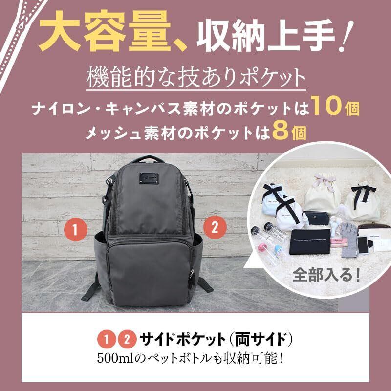 【おすすめポイントいっぱい!】①パパも兼用しやすい、スタイリッシュなデザイン!②整頓しやすい10ポケットで使い心地も抜群汚れにくい③安心の撥水加工(ナイロン素材は強撥水、キャンバス素材は内側撥水)④抱っこ紐をしたまま、バックルを外すだけでリュックがおろせる⑤中身が取り出しやすい自立型⑥背負ったまま取り外し可能な背面ファスナーは盗難防止にも⑦キャリーケースにオンできるベルトつき⑧取り外し可能なベビーカーフックつき⑨樹脂ファスナーでベビーの素肌を傷付けにくい
