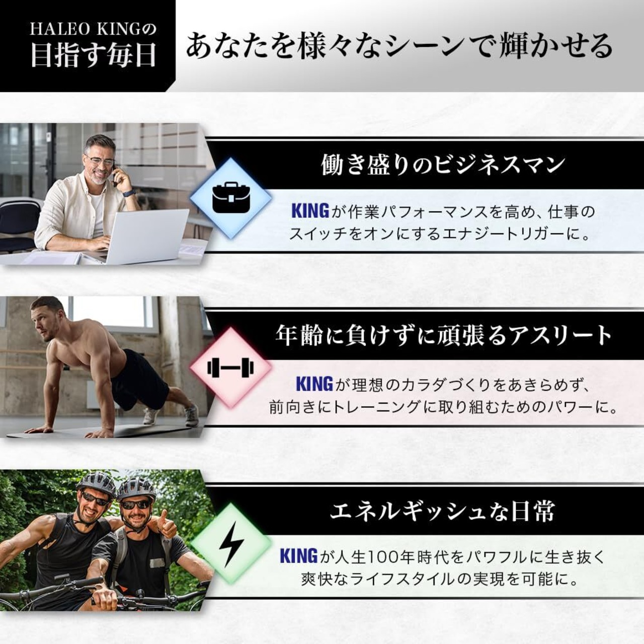 【かつてのエナジーブーストを求める方へ】以前のように思ったようなカラダづくりができない、仕事にのめりこむことができない、なんとなく毎日の調子が上がらない、などネガティブな状況に陥りやすくなってきたという方のためにHALEOが開発したのが「KING」だ。世の中で"KING”と呼ばれるにふさわしい成功をおさめている男性は、年月を重ねても自身のパワーを高めるようなライフスタイルを実践している。HALEOのKINGは栄養面からその理想的なコンディションの実現をサポートする。KINGの豊富なエビデンスを有する3種の古代植物由来成分がカラダづくりからビジネス、日常生活に至るまでパワフルそして意欲的に取り組むための強力な味方となってくれるだろう。