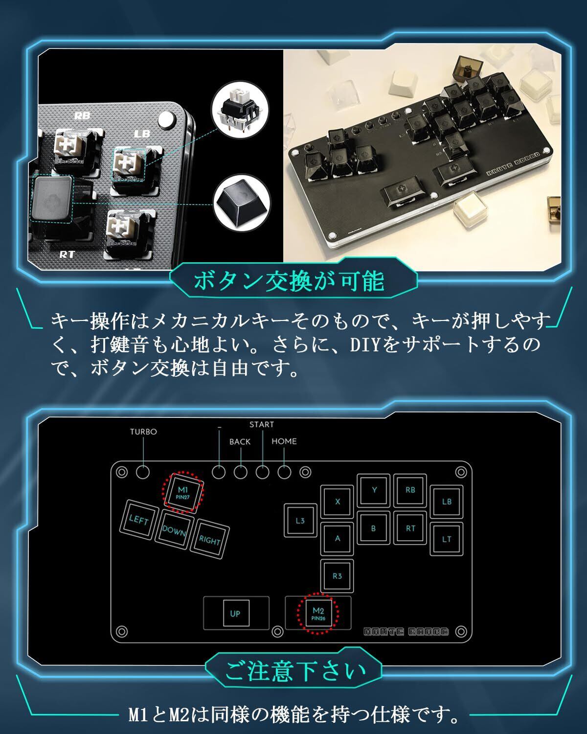 【ご注意】 For PS4/PS5本体の接続については、Haute42公式サイトまたはマニュアルを参照して設定する必要がありますので、必ず日本語取扱説明書または公式サイトのリンク先(haute42.com/supports/)をよくお読みください。PS5やXBOXに接続する際は、専用の格ゲーコンバーターが必要です、互換性を確保するために、ぜひ別途にご購入ください。弊社では、PS4/PS5に対応したBooter5コンバーターと、XBOX用のBrook Wingman FGCを取り扱っています。PS4で使用していて認識しなくなった場合は、格闘ゲーム用コンバーターを介して接続することで問題が解決します。M1とM2は同様の機能を持つ仕様、192.168.7.1のWebプラウザで、キー機能を変更出来ます。