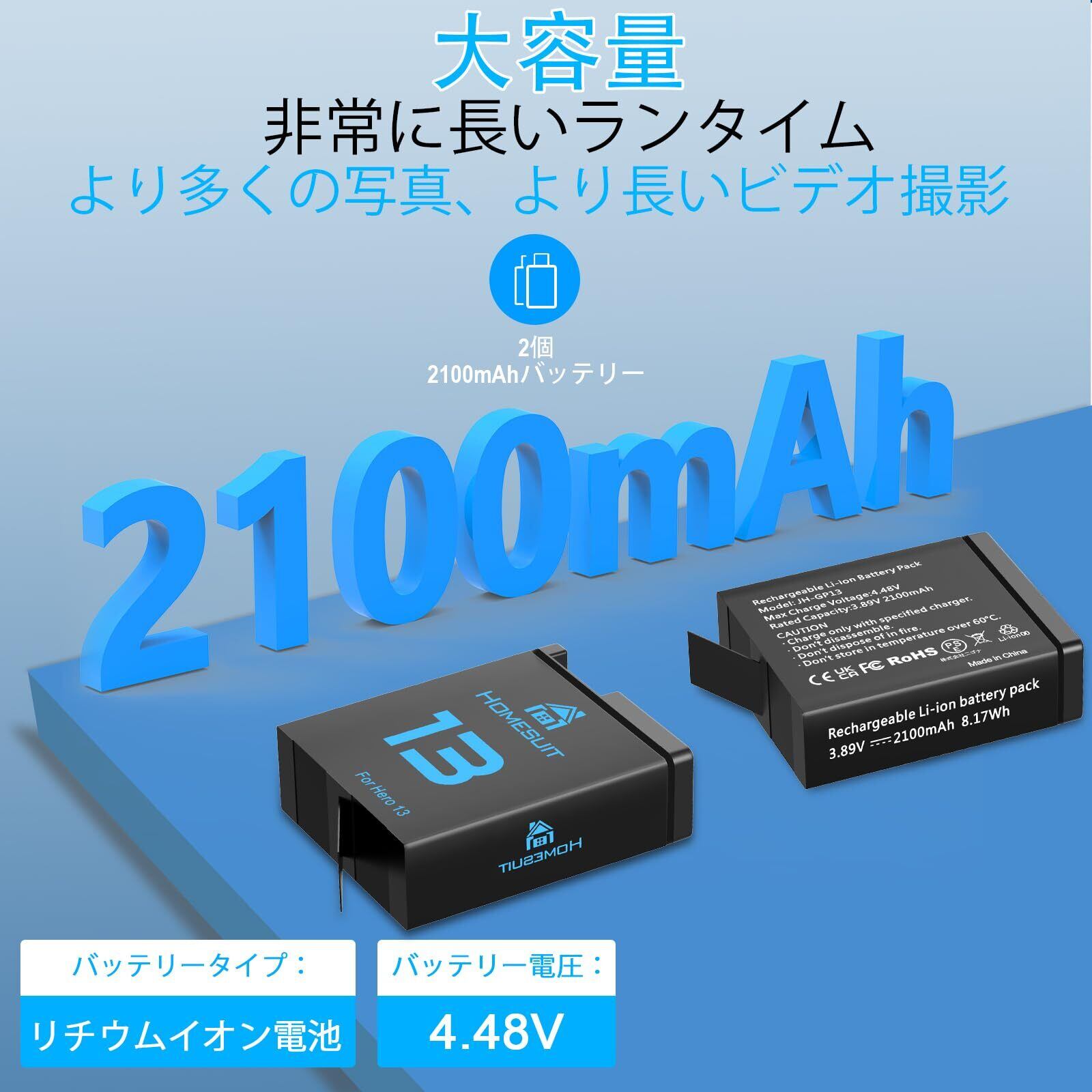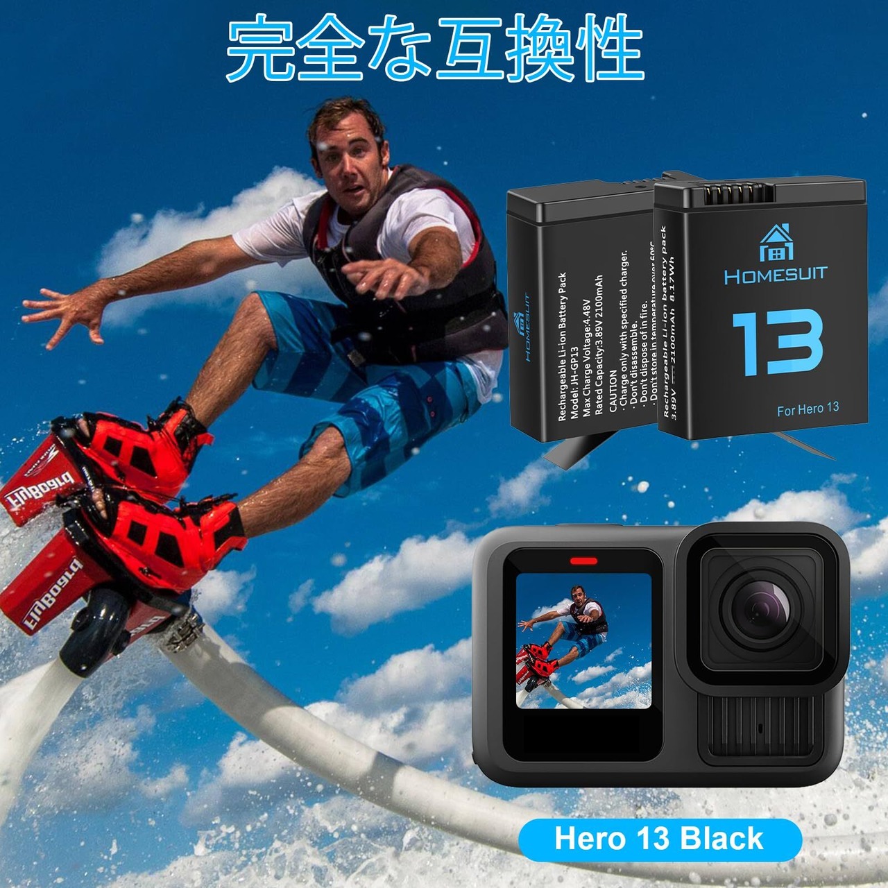 Homesuit Hero 13 Enduro バッテリー 充電器セット 2*2100mAh大容量電池 USB 収納式充電器 LED付きHero 13予備バッテリー チャージャー 2個同時充電可能 Hero 13 Black カメラに対応