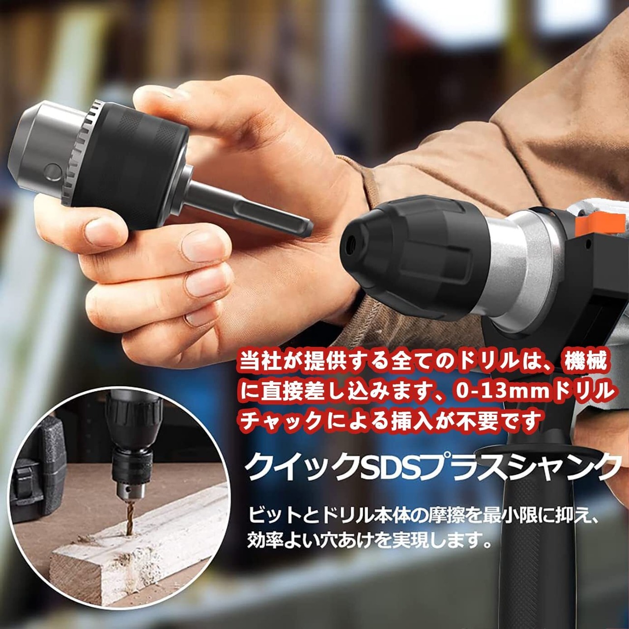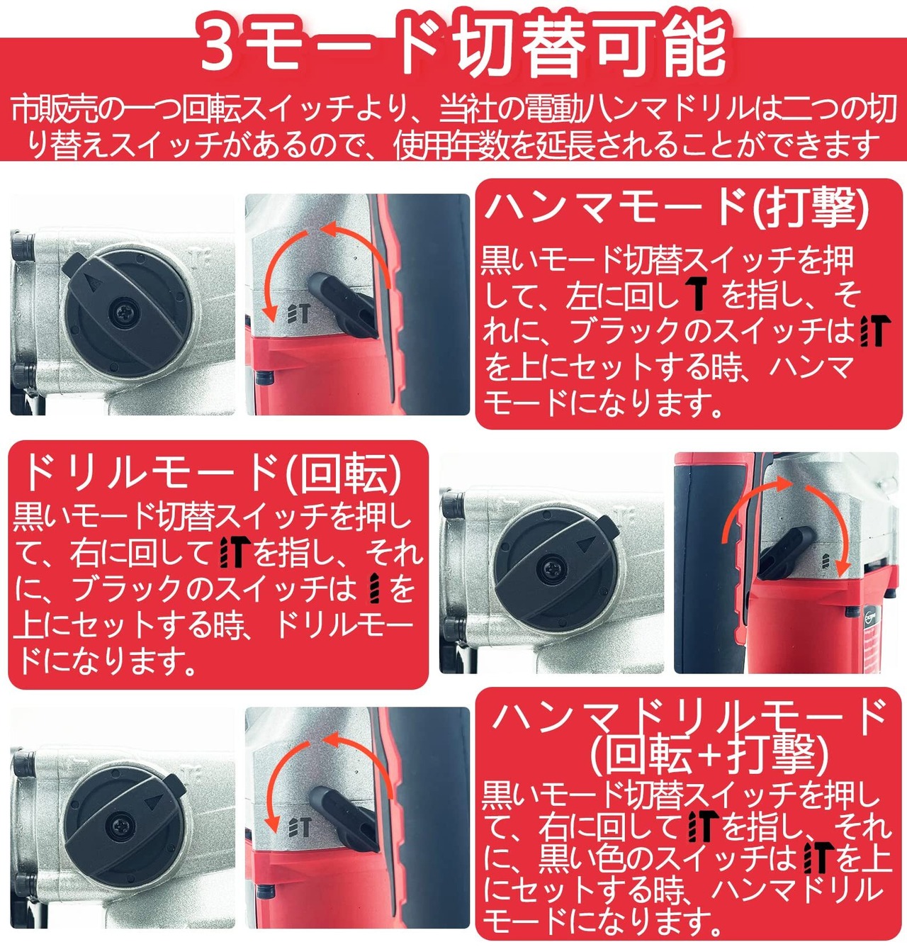 【3モード切替可能】用途に応じて「回転」「回転+打撃」「打撃」に自由に切り替えます。木材、金属、セラミックタイルなどの穴あけ、壁と地面の解体、様々な作業に最適です。市販売の一つ回転スイッチより、当社の電動ハンマドリルは二つの切り替えスイッチのデザインで、使用年数を延長されることができます。