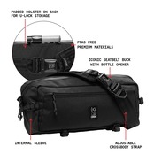 成型パッドを使用したショルダーストラップは、背負った際の安定感と装着感を実現する。また二重構造になったベルクロには、別売のPHONE POUCHやCHROMEアクセサリーがアタッチ可能。財布、鍵、タブレットなどの身近なアイテムはもちろん、2Lペットボトルも収納可能。またメイン部には機種によっては13インチPCも収納可能となっている。10.5インチ ipad PROは大きなポケットへ、ボールペンや鍵などのバッグ内で迷子になりやすいツールも整理して格納可能。自転車乗りにはとても便利なU字ロックホルスターを背面に完備。ライディング時に自転車を守るロックを、迷うことなくスマートにホールド。