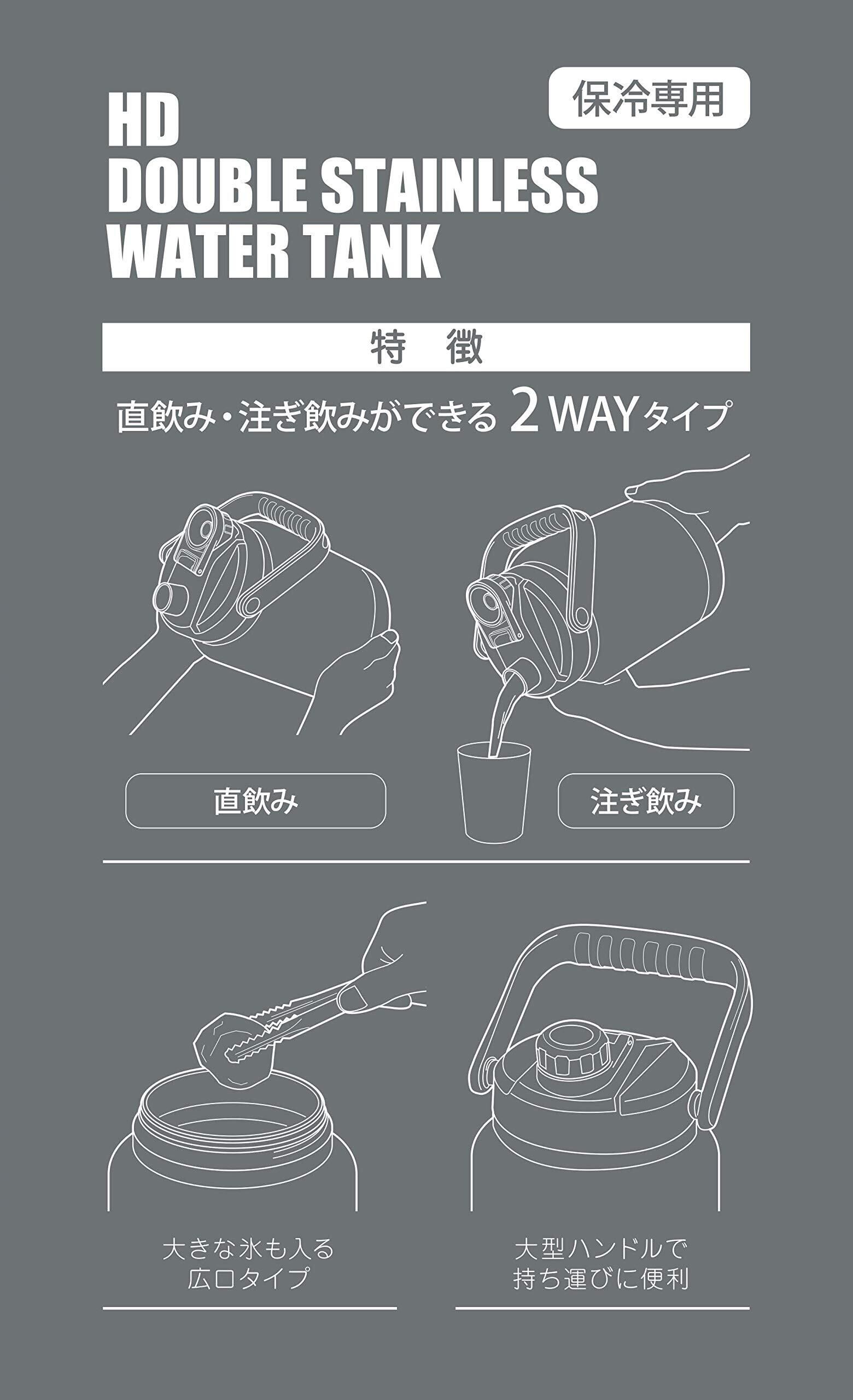 キャプテンスタッグ(CAPTAIN STAG) スポーツボトル 水筒 直飲み 注ぎ飲み ダブルステンレスボトル 真空断熱 保冷専用 HDウォータータンク 2.5L UE-3529/UE-3530/UE-3586