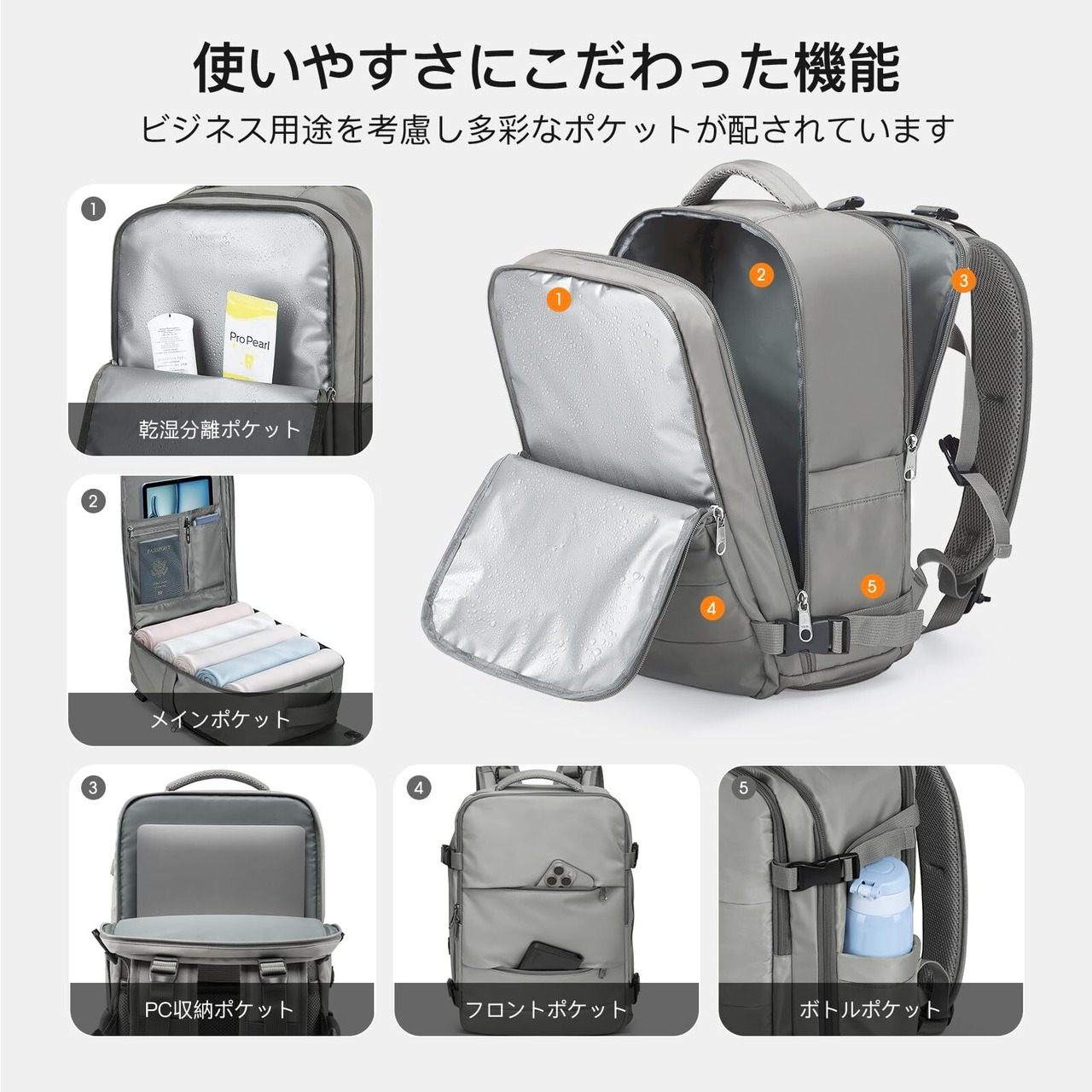 【多機能ポケット】合計11個のポケットを備え、荷物を効率的に整理可能、仕分けやすく取り出しやすいです。乾湿分離ポケット:ジム後の汗染みタオルや濡れた折り畳み傘を衣類と完全分離。衝撃保護PCポケット:厚めクッションで15.3インチノートPCを安全に収納。フロントポケット:ペン、名刺、スマホを秒速で取り出し可能。靴ポケット:通気孔を備えた独立ポケットで、靴のニオイや湿気が衣類に移る心配なし。大容量ながら洗練されたシルエットを実現したビジネスバックパックです。