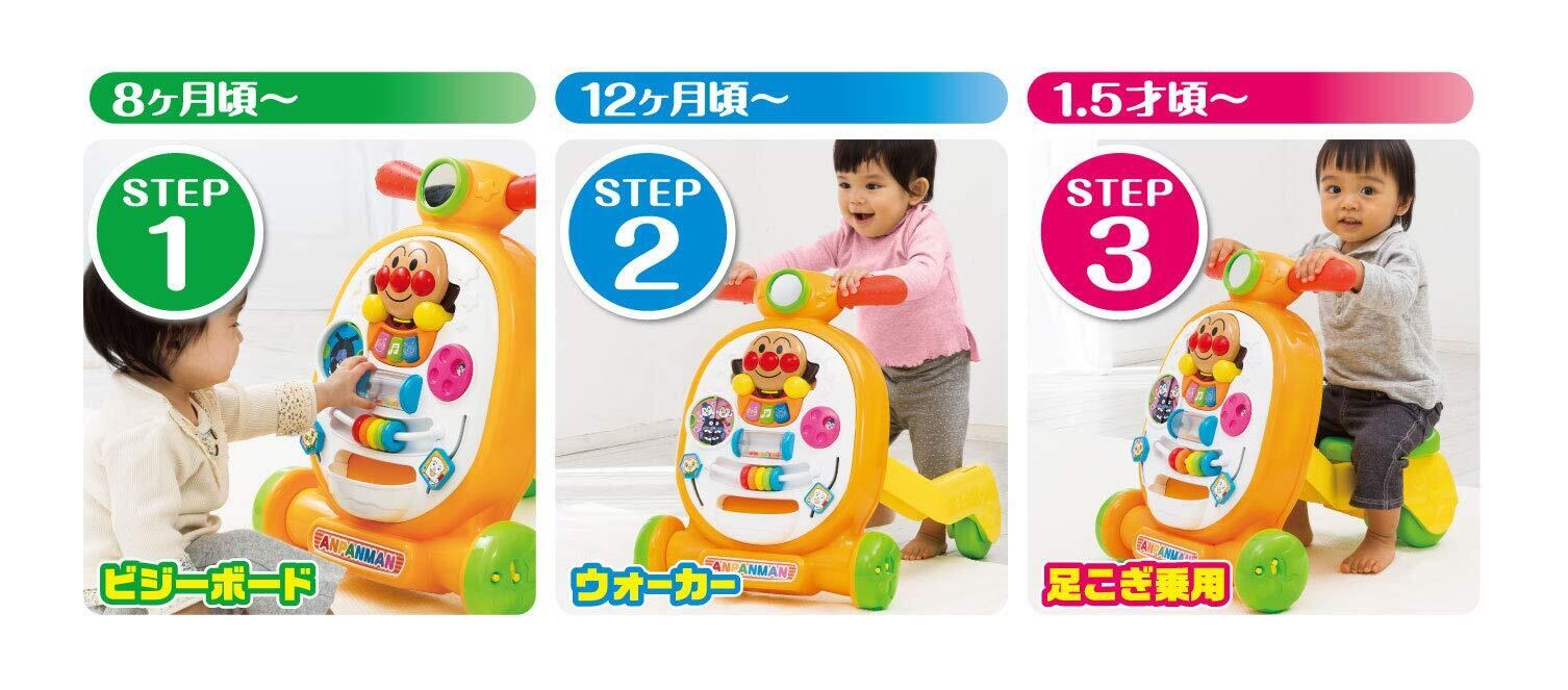 ●成長に合わせてビジーボード(おすわりの頃から)、ウォーカー(あんよの頃から)、乗用(1.5才頃から)の3STEPで長く遊べます!