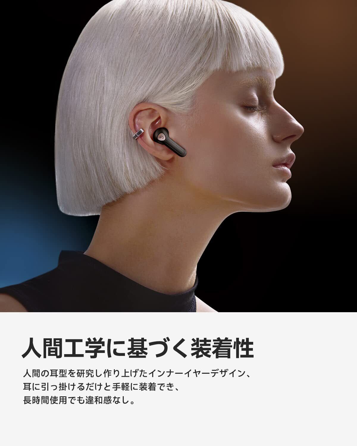 【まるで空気のように軽い装着感を実現するインナーイヤーデザイン】人間の耳型を研究し作り上げたインナーイヤーデザイン、耳にかけるだけで装着できます。耳に余計な負担を与えることがなく、装着中の痛みや不快感が少ないので、長時間の音楽リスニングもストレスフリーで快適にご使用いただきます。製品に内蔵のセンサーにより着脱を検出し、音楽の一時停止・再生を自動で行う機能も用意しています。