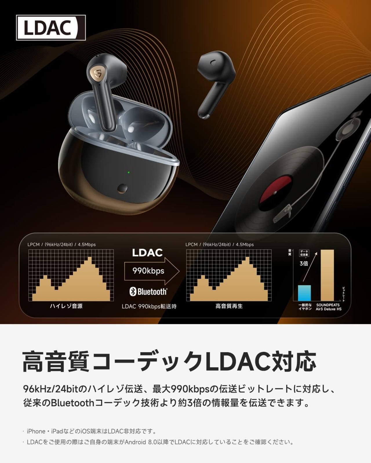 【ハイレゾの音を生きたまま届ける「LDACコーデック」対応】従来のBluetoothコーデック技術であるSBCと比べ最大約3倍の情報量を伝送できる、ハイレゾ相当の高音質を誇る「LDAC」に対応しています。最大990kbpsの伝送レートを確保することで、96kHz/24bitまでの音質伝送を実現しました※。音の歪みを大幅に低減し、飛躍的な音質向上を実現します。原音を忠実にトレースし、ハイレゾ音源の繊細なニュアンスを描き出します。※ハイレゾコンテンツをLDACコーデックの最大転送速度990kbpsで伝送する場合。