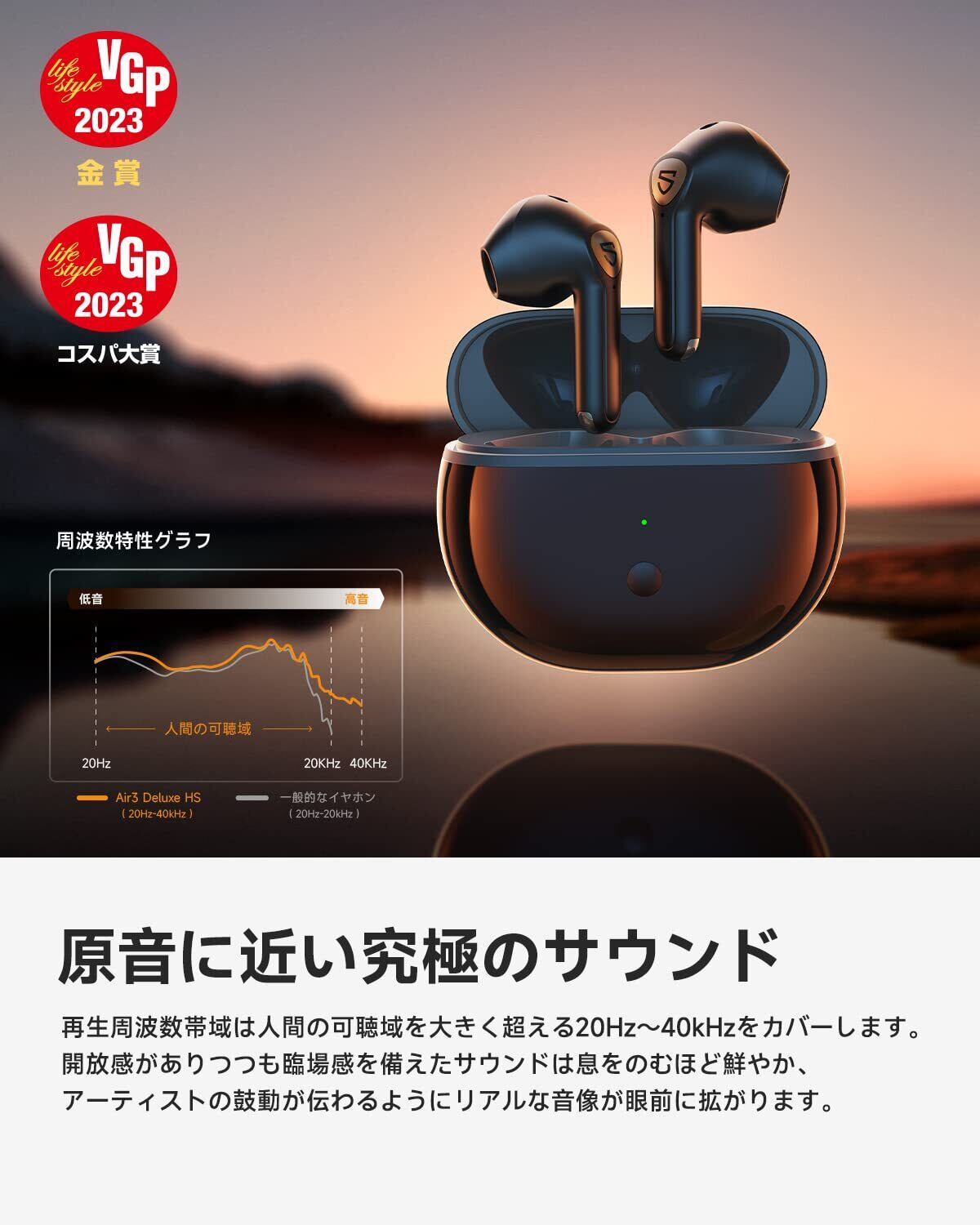 【インナーイヤー型の完全ワイヤレスイヤホンに画期的なブレークスルー】世界初、日本オーディオ協会の「Hi-Res Wireless」ロゴを冠したインナーイヤー型完全ワイヤレスイヤホン。(*2022年8月30日時点、SOUNDPEATS調べ。LDAC対応インナーイヤー型完全ワイヤレスイヤホンにおいて) 最大20Hz~40kHz(従来型コーデックは20Hz~20kHz)という広い再生帯域をカバーすることで、ボーカルや楽器の音を繊細に再現します。従来技術では表現が難しいボーカルのディテールや金管楽器の繊細な響きも、丁寧に描写します。