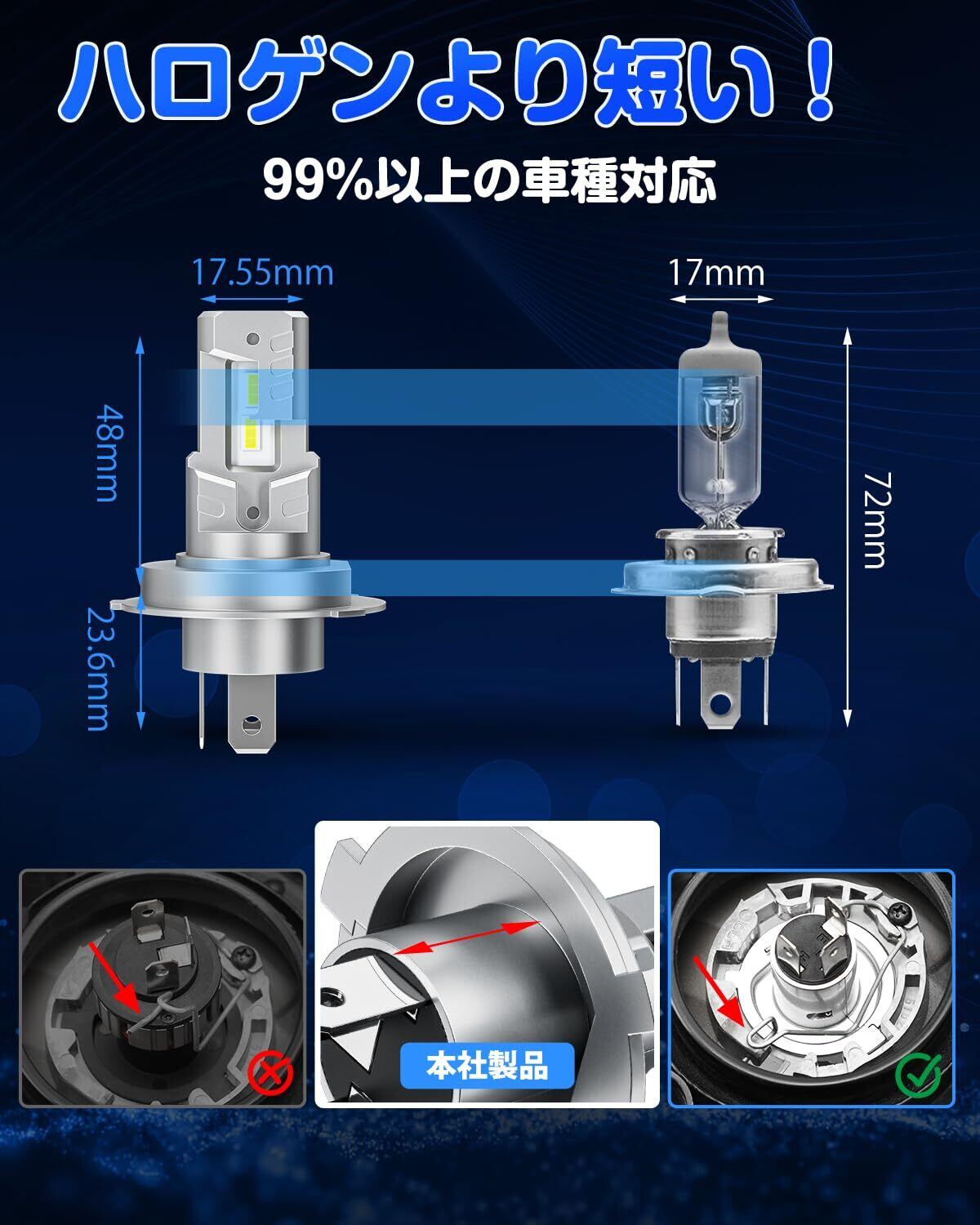 【ノイズキャンセラー内蔵&光軸調整済み】ノイズキャンセラー内蔵H4 LED ヘッドライトなので、FMラジオのノイズを防止、快適なドライブができるようになりました!また純正フィラメントと同位置での発光を実現しましたので、バルブでの光軸調整は不要です。切れのいいカットライン、ハロゲンより瞬時に立ち上がり、明るく、快適、安全なドライビングをお楽しみください。面倒な光軸調整、固定工具作業等は必要ございません。