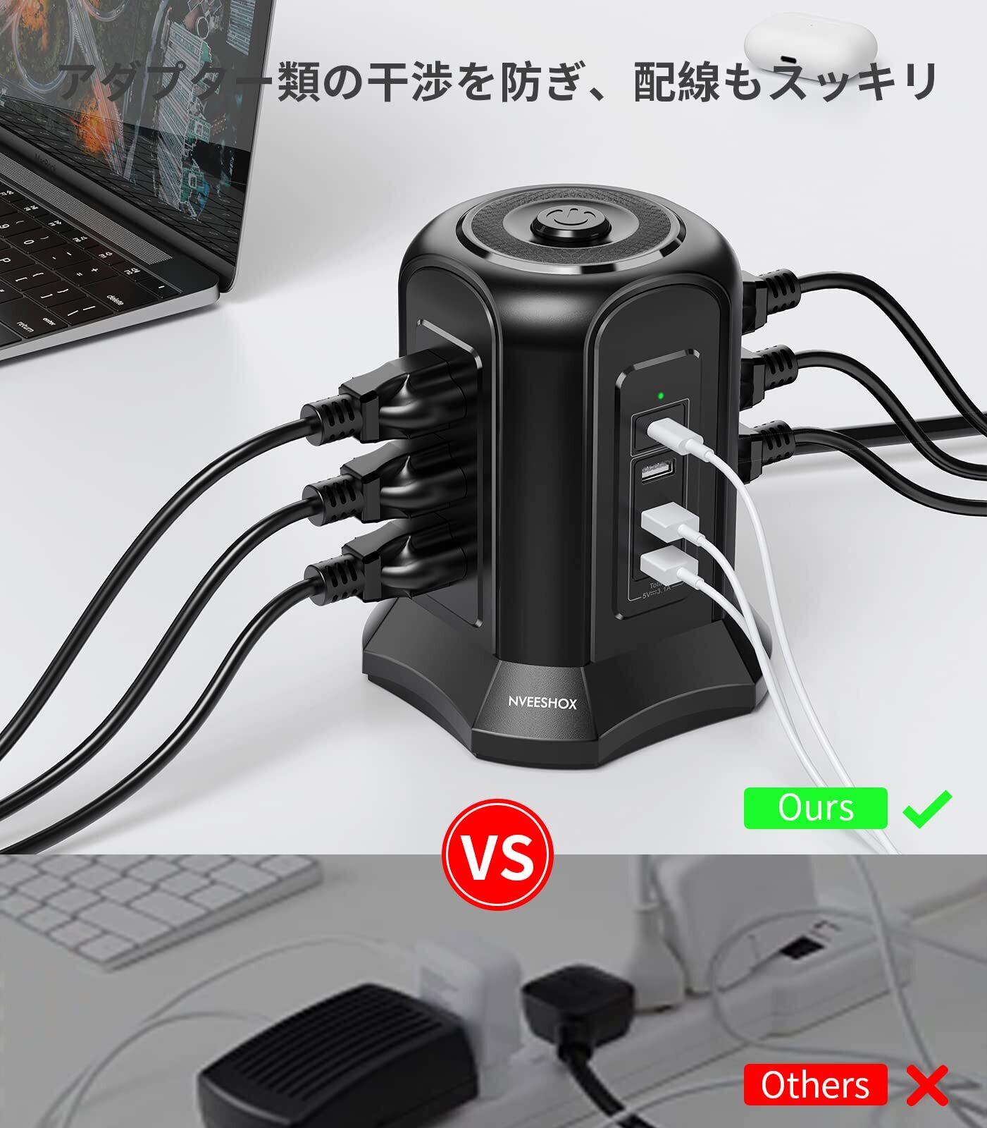 電源タップタワー型 Type-C付 PD機能付き usbコンセント 延長コード 2m 雷ガード 9個AC口 4個USBポート たこあしコンセント テーブルタップ OAタップ 安全保護機能 自宅用 会社用 ブラック NVEESHOX