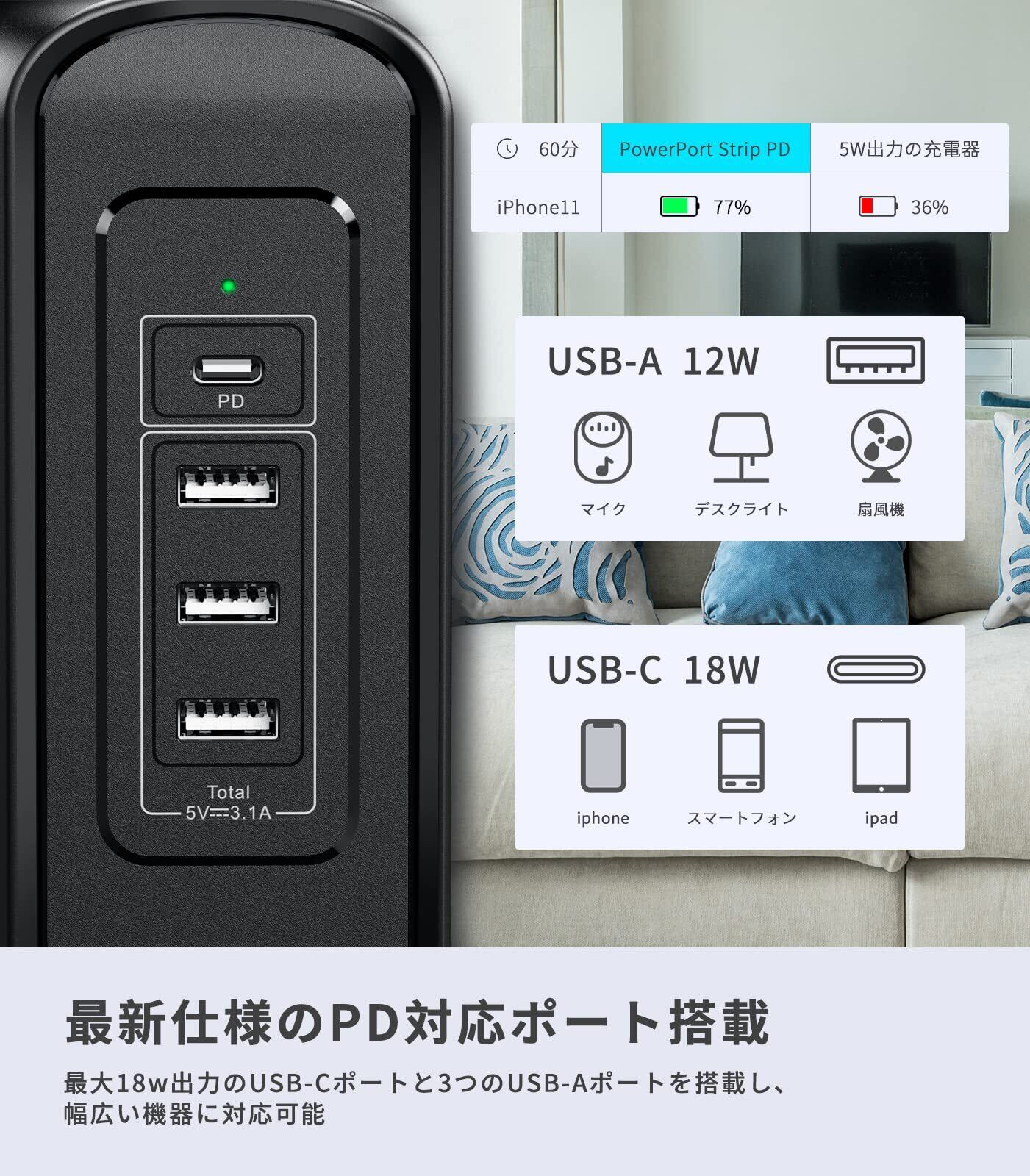 【type-c(PD)付き電源タップ】18WのUSB-C(PD)電源アダプタが搭載しており、iPhone側の「最大18W」という制限により、「5V/3A、9V/2A、12V/1.5A」に対応したUSB PDアダプターであれば、上限いっぱいの速度で高速充電できます。接地極付コンセントが4面中3面に各3コずつ有り、全部で9コあります。なお、他の1面には1つのtype-cと3つのtype-Aが並んでいます。