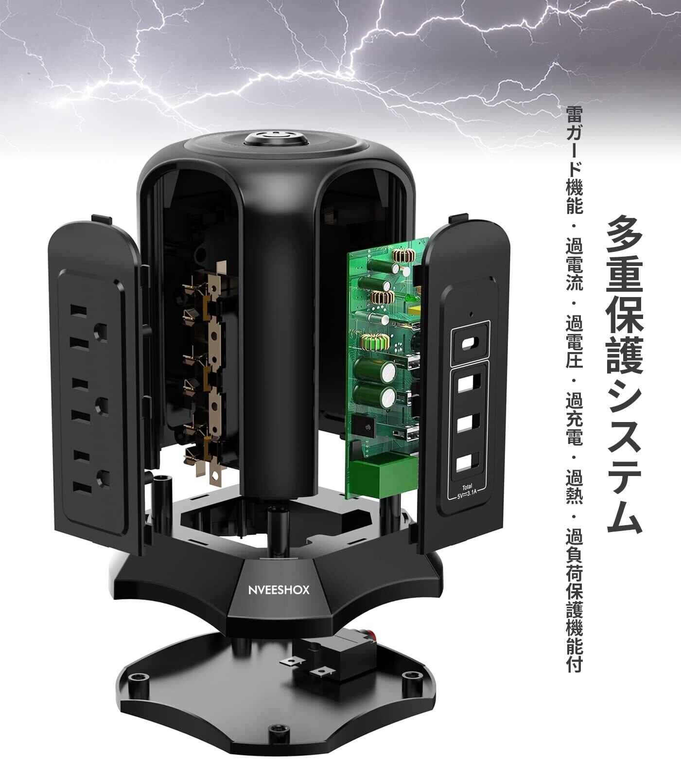 【多重保護システム】この電源タップは雷ガードを内蔵しており、恐ろしい雷から機器をガードすることに加えて、ブレーカーを内蔵しており、接続している機器の消費電力の合計が1500Wを超えた場合、ブレーカーが作動し電源が切れます。そして、シェル素材は難燃ABS樹脂とPC94V0より作られて、耐火性は750℃に達します。更に過電流、過電圧、過充電、過熱など多重保護を搭載しており、お客様の安全とお使いの家電をお守りできます。
