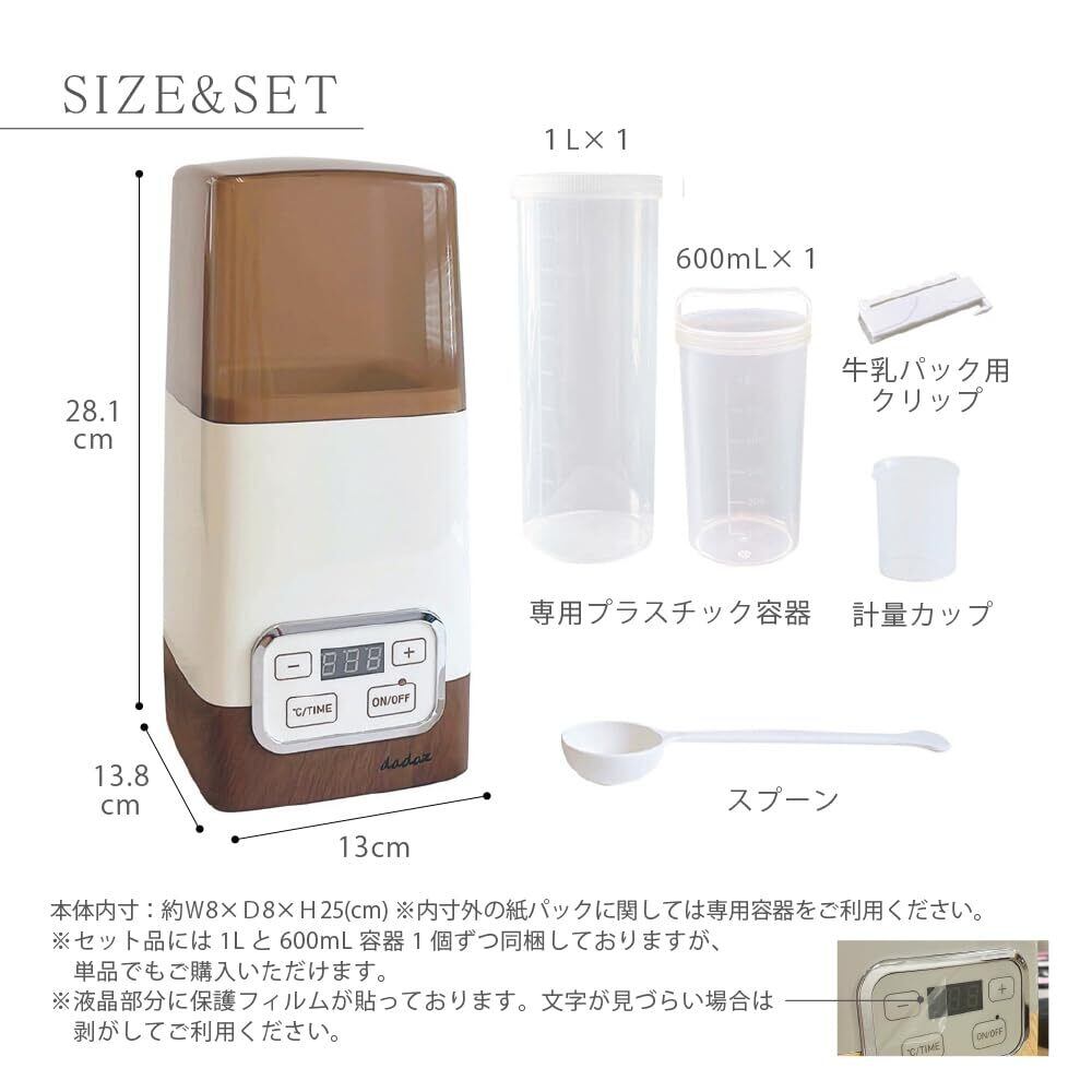 【セット内容】 ヨーグルトメーカー本体 / レシピ本 / 専用容器1L / 専用容器600ml /スプーン×1(約24cm)/ 計量カップ / 牛乳パック用クリップ / 6ヵ月製品保証書付取扱説明書