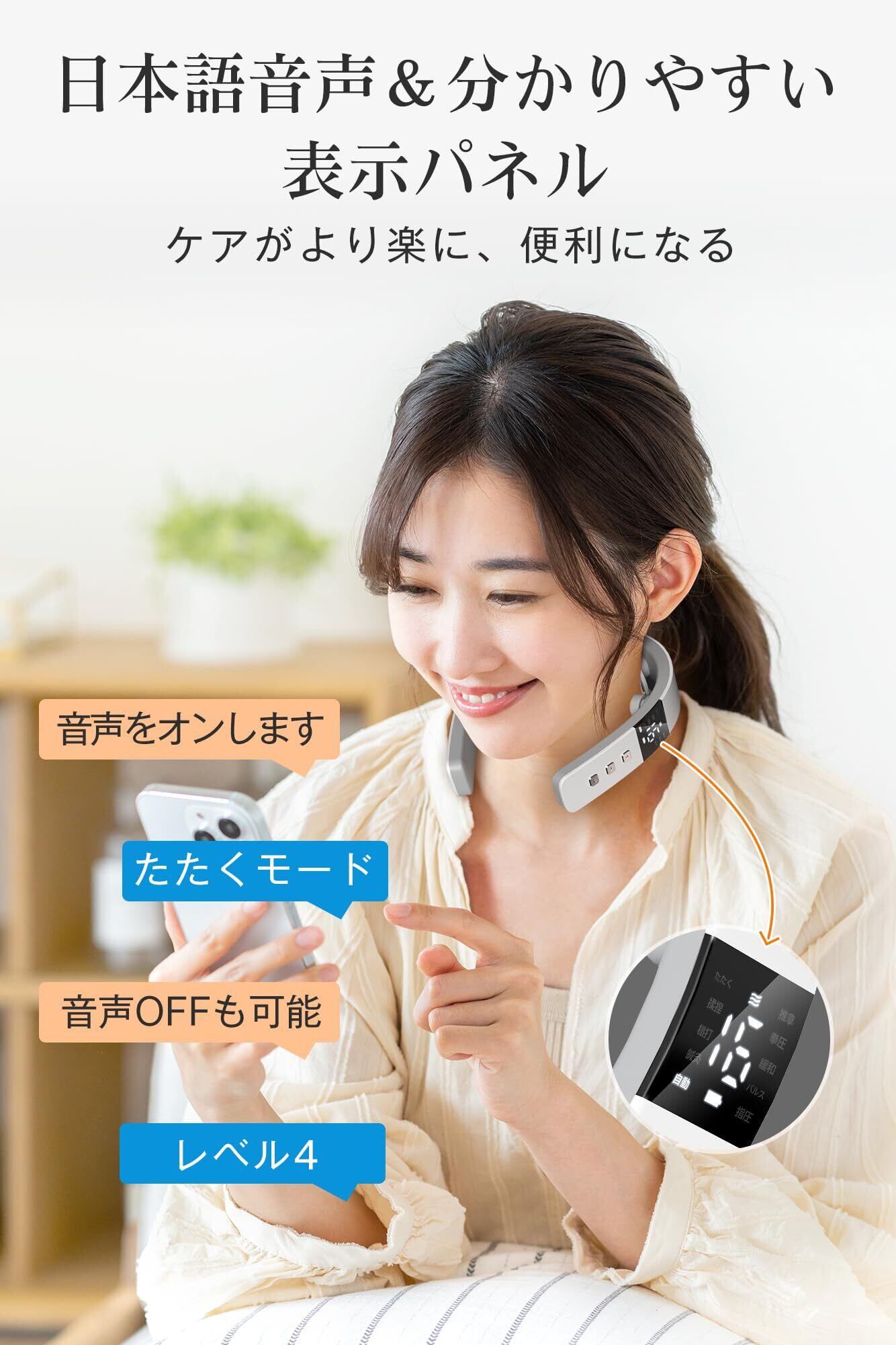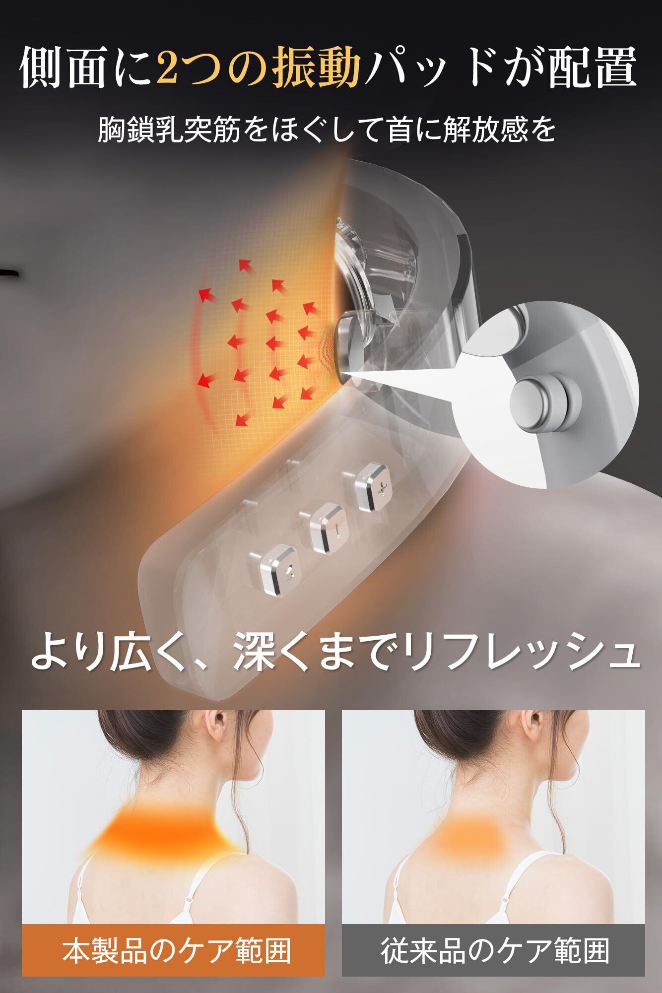 【最新設計の首リラクゼーション器&機能UP・装着感UP】首の後方の「パルス・加熱パッド」と 首の側方の「振動パッド」で首周りをを広範囲にケアしてくれる!後方にパルス刺激(TENS×EMS)とヒーター機能のダブルの力で、僧帽筋(首を支えている筋肉)を刺激してほぐします。同時に首の側面の胸鎖乳突筋(肩の違和感に繋がる)に心地よい振動が届き、。また、デザイン面、✩✩✩従来と違った薄型デザイン採用でひとクラス上のフィット感を実現しました。