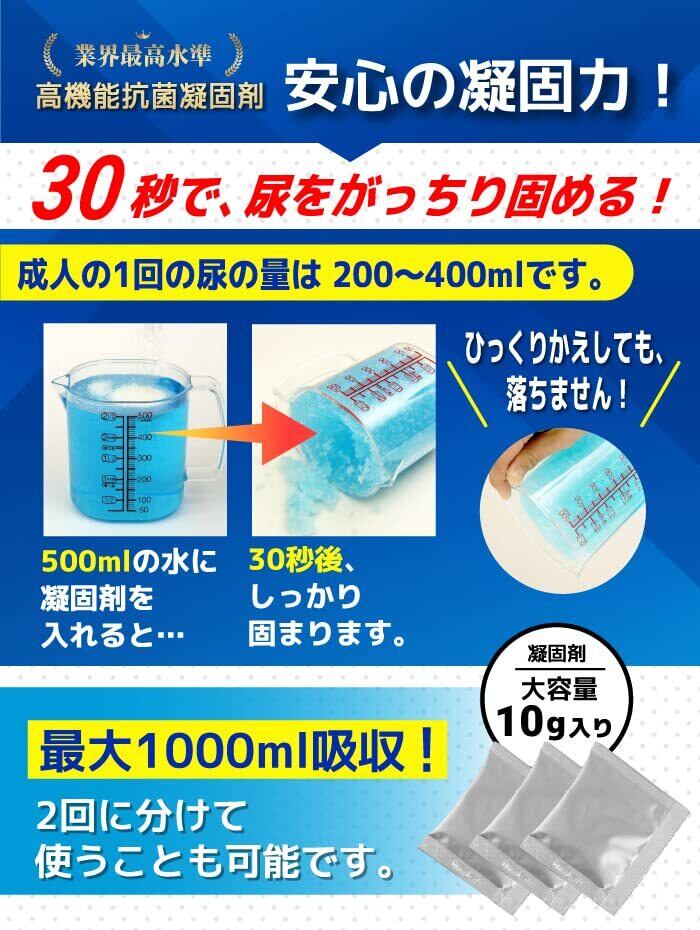 【安心の凝固力!】 弊社の凝固剤は10g入っています。 1リットル以上吸水することができるので、一袋で2~3回吸収することができます。