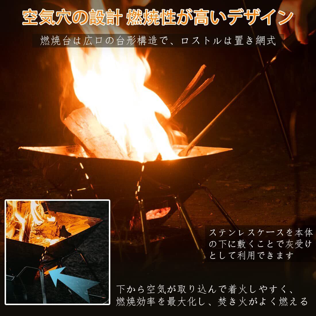 【燃焼効率性が高くなる】燃焼台は広口の台形構造、ロストルは置き網式。燃焼台の下から空気が入り燃焼しやすく、燃燒効率が最大化され、二次燃焼で焚き火が綺麗に燃えます。