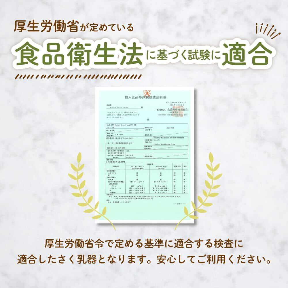 【食品衛生法に基づく試験に適合】厚生労働省令で定める基準に適合する方法で実施した検査で、適合したさく乳器です。もちろん、BPAフリーです。