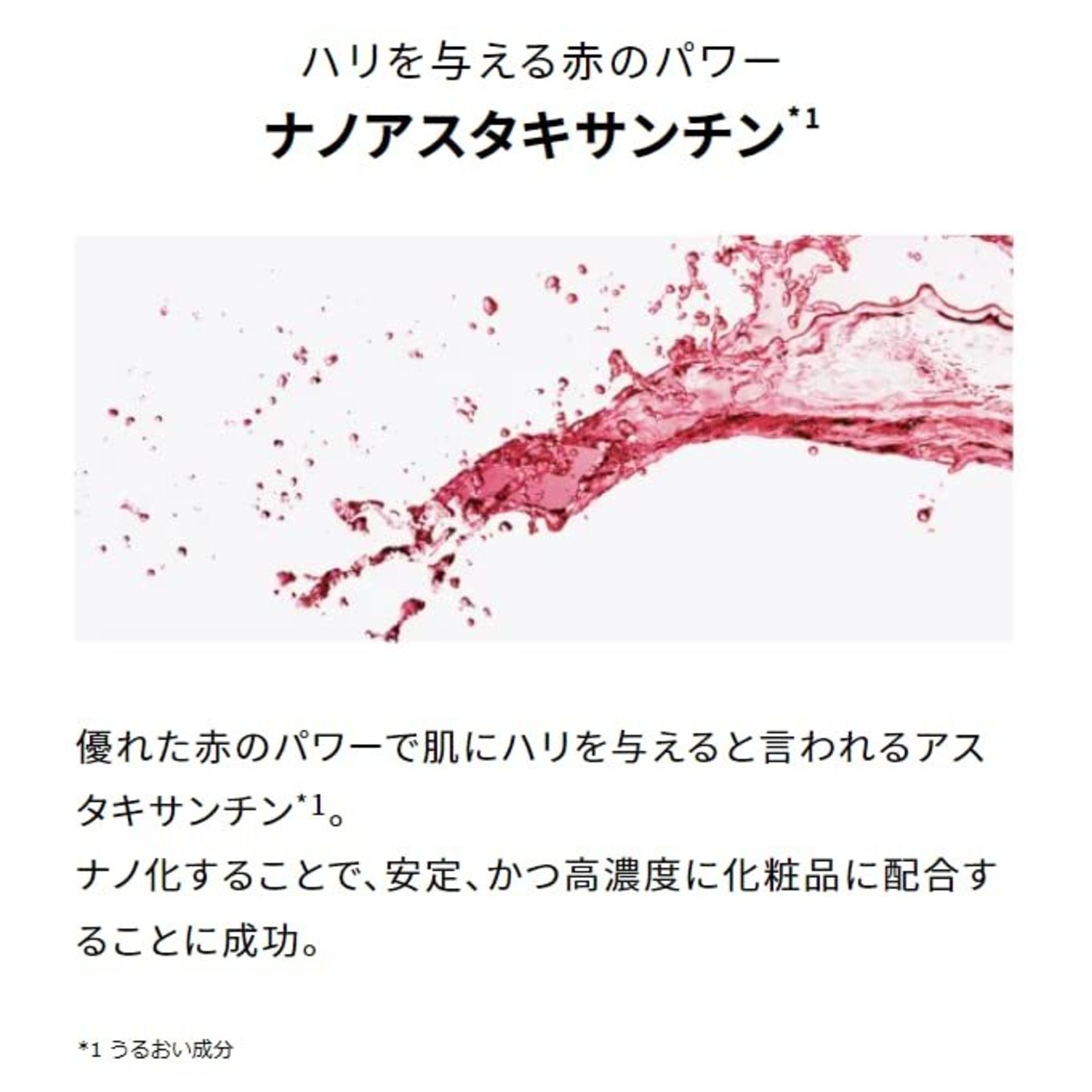 【ハリを与える赤のパワー ナノアスタキサンチン*1】優れた赤のパワーで肌にハリを与えると言われるアスタキサンチン*4。ナノ化することで、安定、かつ高濃度に化粧品に配合することに成功。【注釈】*1 うるおい成分
