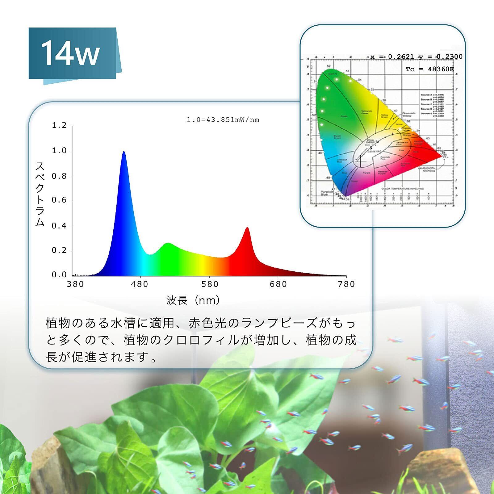 【高品質の水槽ライト】:Hygger水槽ライトの光は、演色評価数は自然光に近い、85%になります。目と魚を保護し、魚と視聴者にストロボ効果によって引き起こされる不快感を防ぐことができます。 高品質の2835+ 5050モデルランプビーズを使用して、少なくとも50,000時間の耐用年数があって、高い耐久性です。