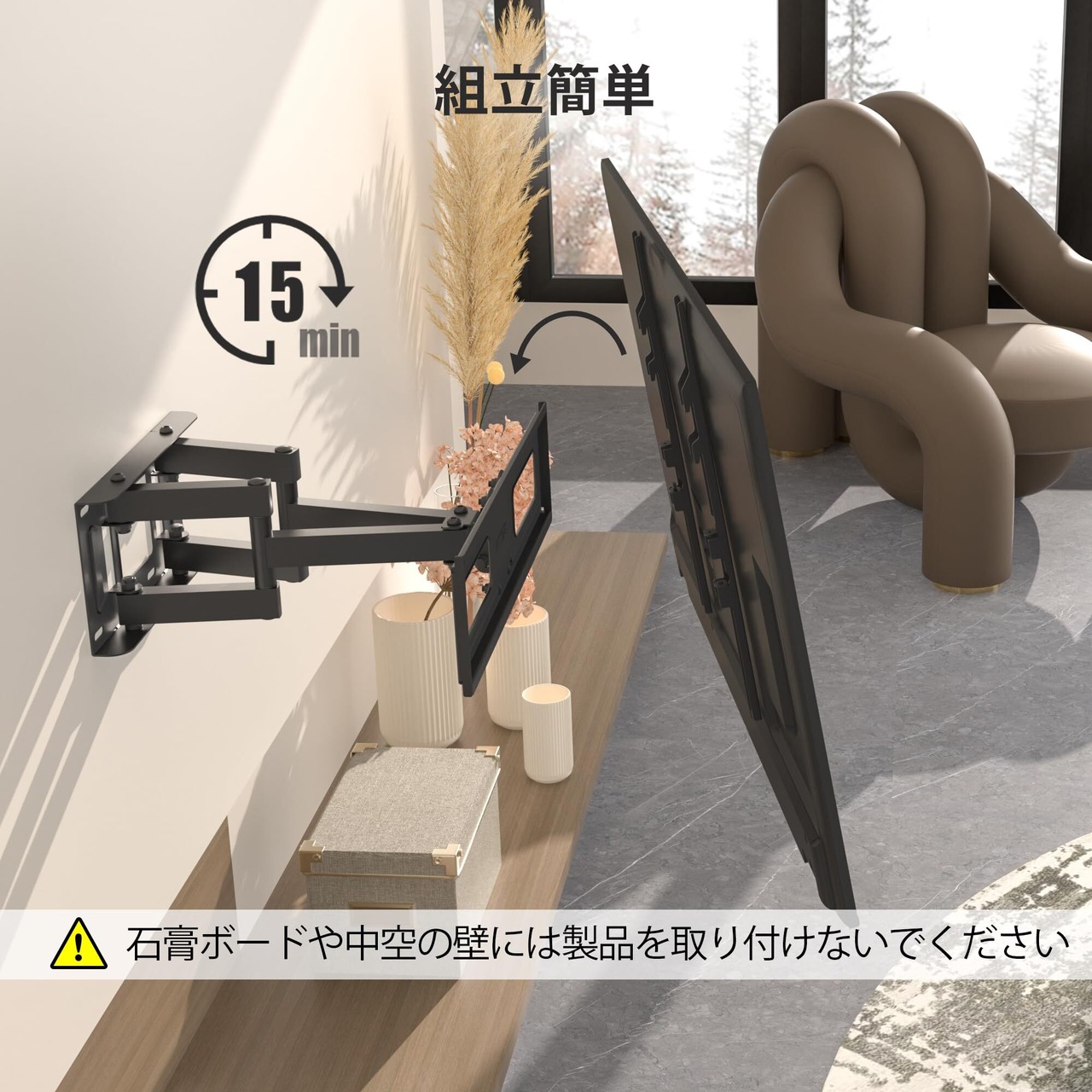 【簡単な取り付け】 このテレビ壁掛け金具は付属のすべてのネジと部品、詳細な日本語の取り付け説明書により、誰でも簡単に取り付けが可能です。設置に必要な工具も揃っており、素早く確実に取り付けが完了します。壁掛けテレビの取り付けがスムーズに行えます