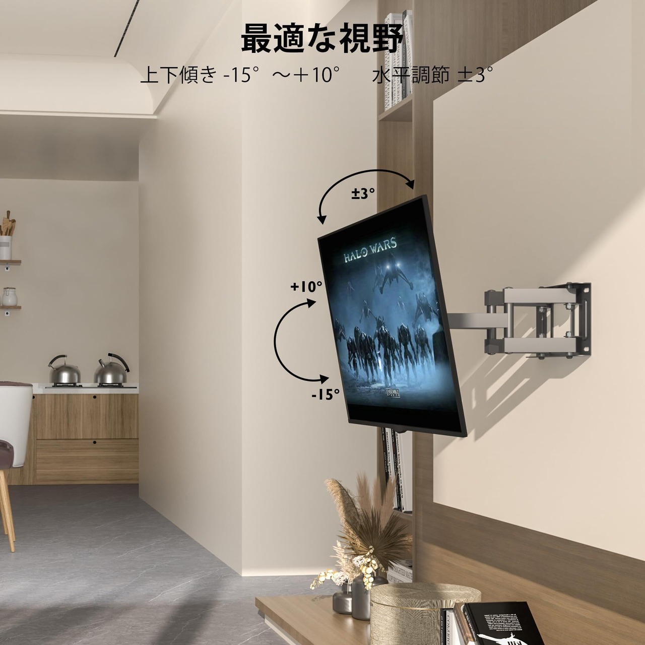 【多角度調節可能】 左右120°、上下-15°から+10°、および水平±3°まで調整可能で、最適な視聴角度を実現します。ソファやベッドの位置に合わせて、テレビの角度を自由に変えることができます。壁掛けTV金具で、最高の視聴体験を楽しみましょう!''