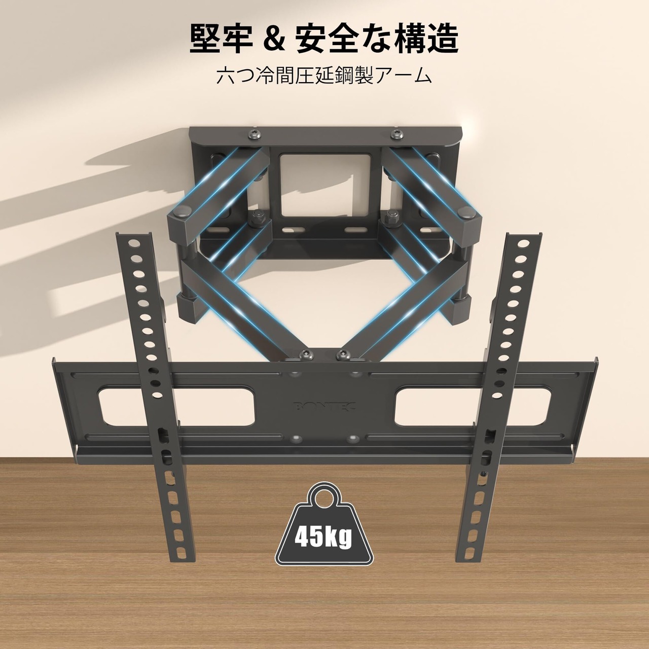 【堅牢な構造】 高品質な冷間圧延鋼で作られたアームは、長期間にわたる使用にも耐える堅牢な構造を持っています。tv壁掛け金具の強化された取り付け部品により、安全性がさらに向上し、安心してお使いいただけます