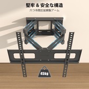 【対応サイズと耐荷重】 このテレビ壁掛け金具は23インチから65インチのテレビに対応し、最大45kgの耐荷重を誇ります。幅広いテレビサイズをサポートするため、家庭やオフィス、店舗など多様な環境でご利用いただけます。壁掛けテレビ金具の理想的な選択肢です