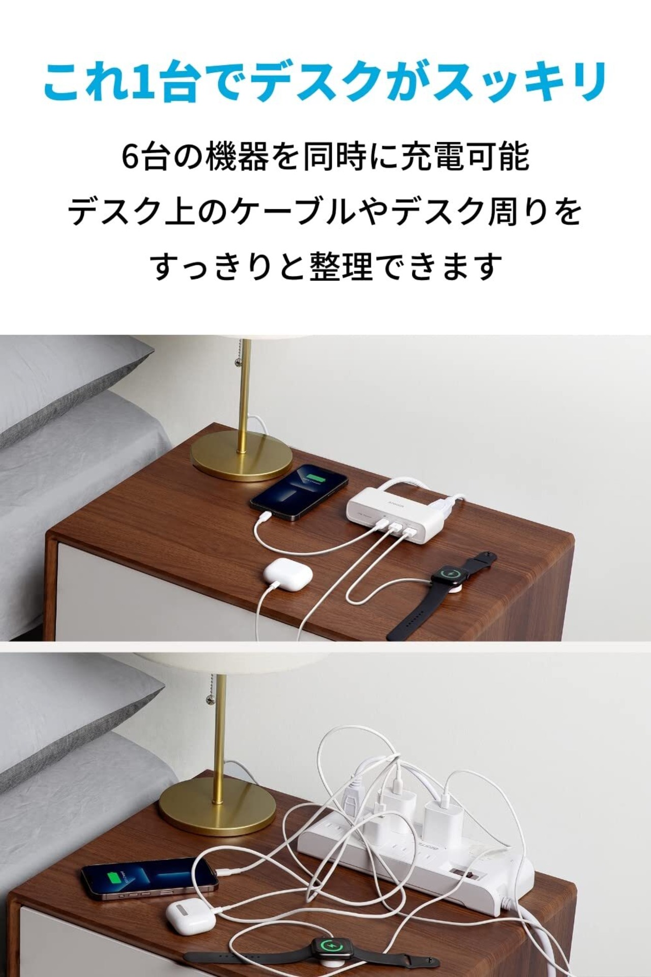 これ1台でデスクがスッキリ:6台の機器へ同時充電が可能。前面にUSBケーブルの差し込み口、背面にAC差込口を配置したことにより、デスク周りをすっきりと整理できます。