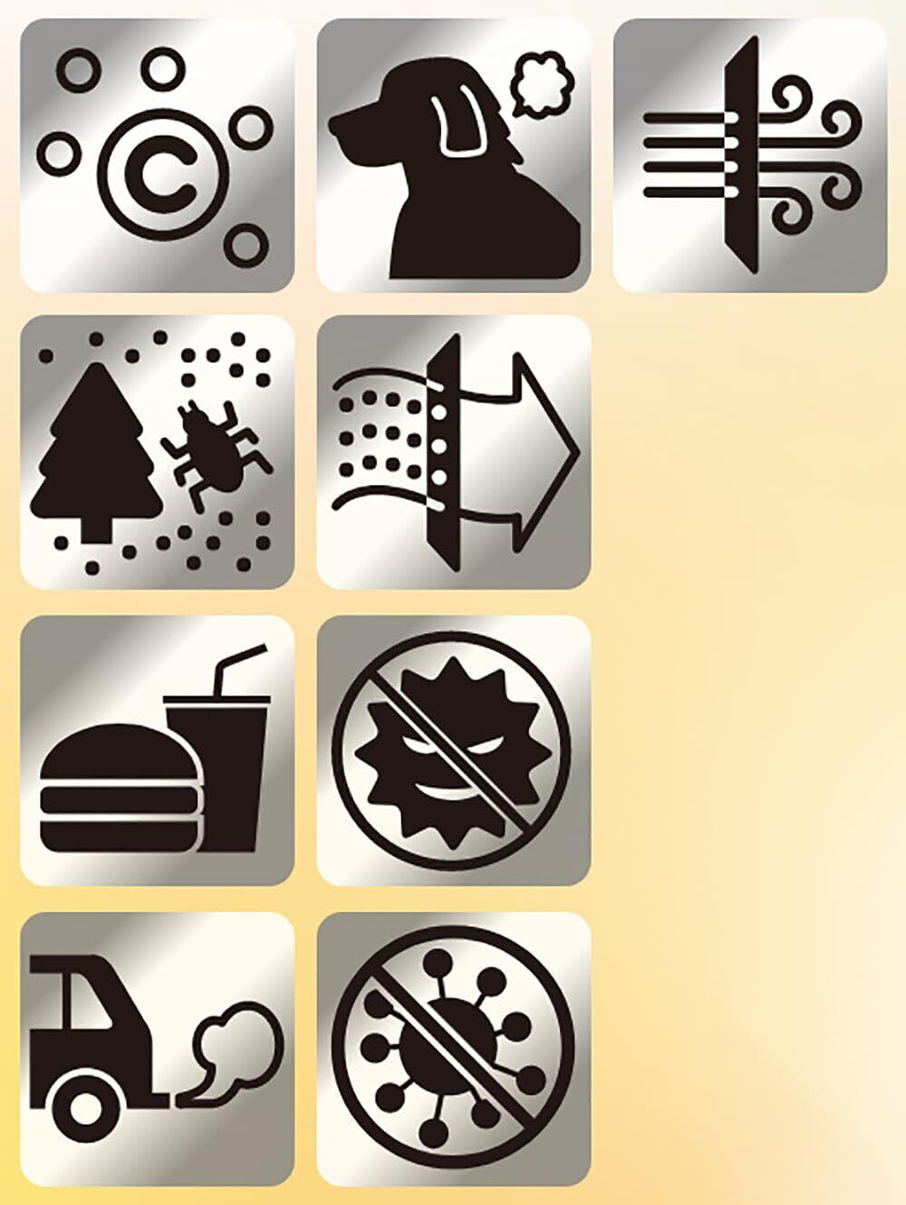 機能 : ビタミンC放出、各種由来タンパク質の減少、脱臭、高除塵、抗菌・防カビ、抗ウイルス、安定風量