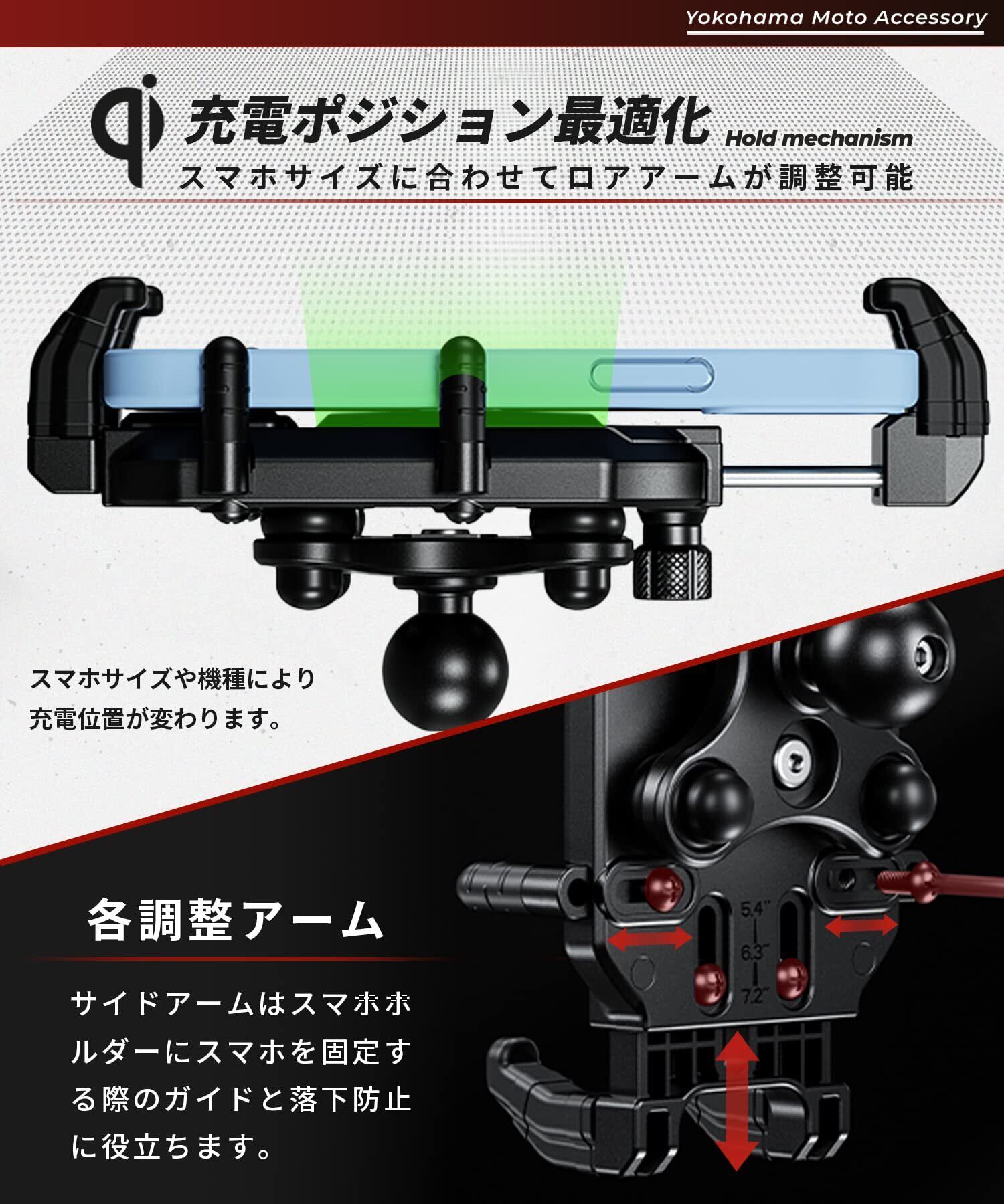 【QI充電&USB充電】 車両12VでQIワイヤレス充電とUSB電源が使用可能。 ■出力:QI15W/10W/7.5W/5W、USB(タイプC)36W(5V3A/9V2A/12V3A) ※機種の要求した電力で充電されます。※機種の要求した電力で充電されます。 ■12V入力:車両12V電源と接続してワイヤレス充電とUSB電源が使用できます。※バッテリーレス車、6V、24Vバッテリー車では使用できません。 ■USB入力:USB入力ではご使用頂けません。 ■防水:IP66防水で突然の雨にも対応。 ■電源スイッチ:ON/OFFのみ。0Vの状態から12Vを受けると自動的に電源が立ち上がります。 ■12V配線:1.75m目立たない黒ダブルコード(プラス側が白の文字のライン)、(ヒューズホルダー付き、ギボシ付き、クワガタ端子変換可能) ■リペア:ワイヤレス充電器、12Vアダプター(USB電源付き)は別体構造のため交換が可能です。