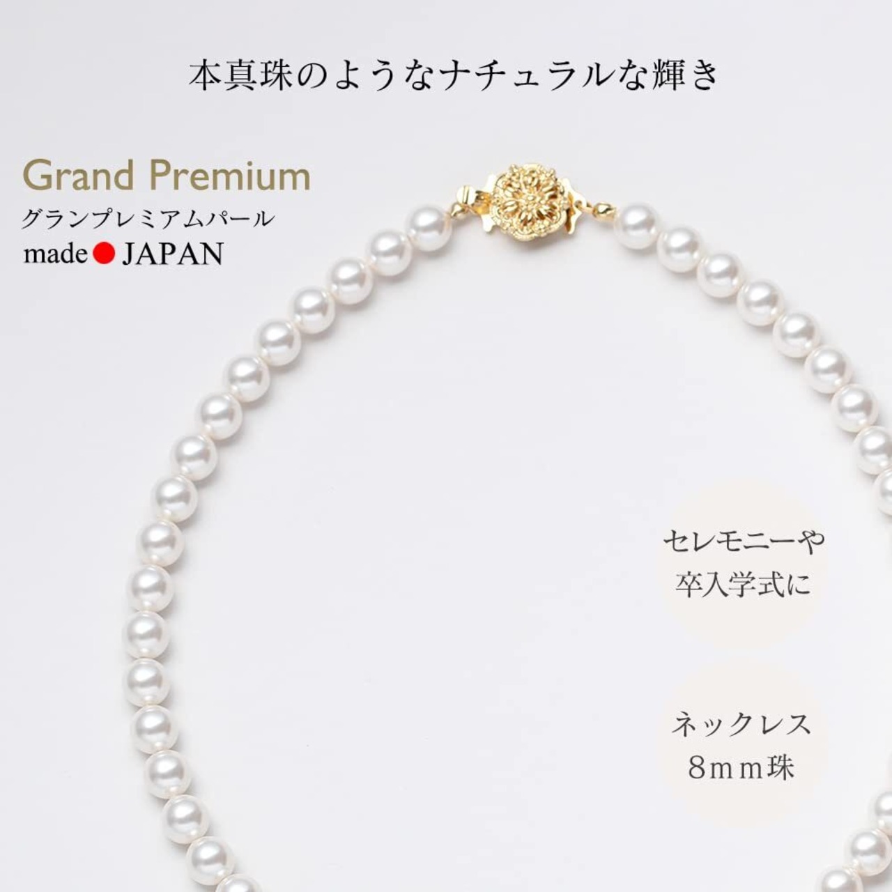 あこや真珠のように美しく輝く真珠のネックレス。クールかつ上品なシルバーの留め具が特徴です。 本真珠のようにナチュラルに輝くグランプレミアムパールの中でも照り・色・キズにこだわり、真円の真珠を使用した高品質なフォーマルネックレス。 国内の自社工房にて職人が丹精込めて製作した美しく真珠が並ぶ高級仕上げです。冠婚葬祭はもちろん、大切な方へのプレゼントにも最適です。