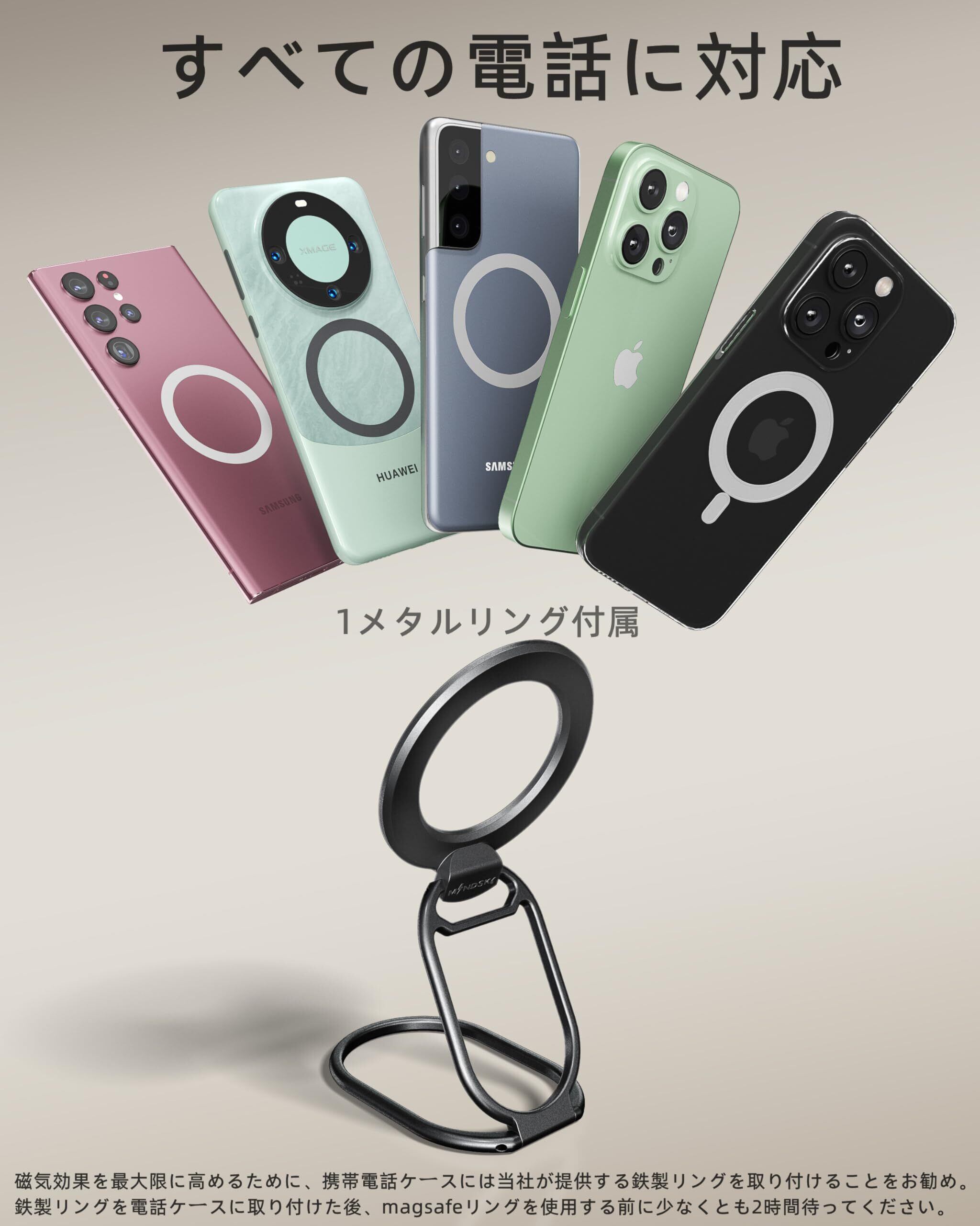【すべての携帯電話に対応】このMindsky電話リングホルダーは、MagSafeデバイスと認定されたMagSafe電話ケースでの使用に特化して設計されています。磁気電話リンググリップは、背面に薄い金属リング(1つのmagsafeリングが付属)が付いた非磁性電話や標準の電話ケースとも互換性があります。iPhone 16promax/15/14/13/12シリーズ、iPhone 11/11Pro/X/XS/XS Max/8/7、Google Pixel、Galaxy、HUAWEI、Samsung、ipadなど、すべてのAppleおよびAndroidスマートフォンと幅広く互換性があります。注:非magsafe電話ケースの場合は、磁気リングを取り付けて24時間待ってからこの製品を使用してください。