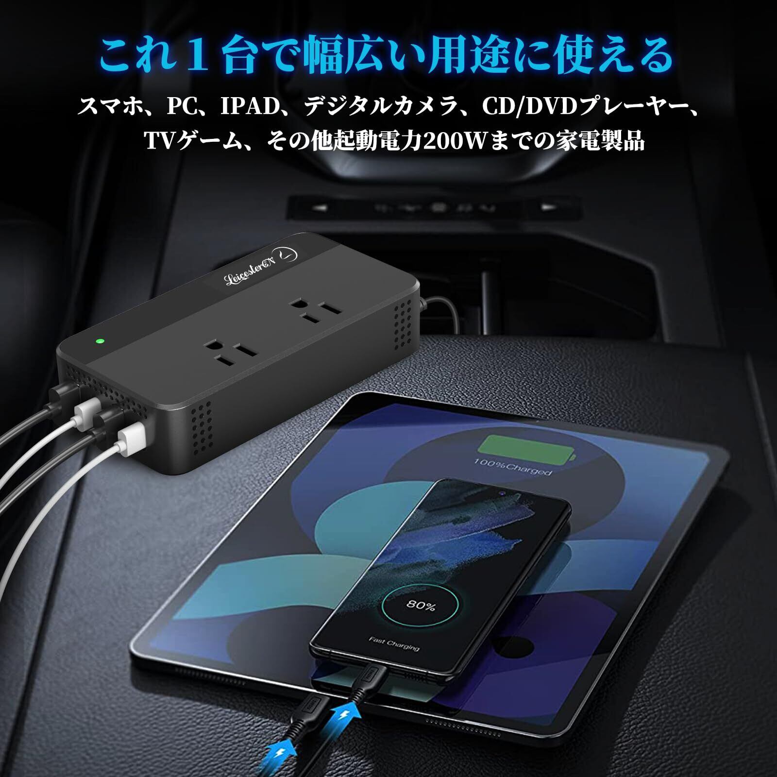 LeicesterCNL LST インバーター 200W カーインバーター シガーソケット DC12VをAC110Vに変換 シガーソケット コンセント 急速充電対応 USB給電4口 USB-Cポート AC100V電源2口 車 コンセント コンバーター 車載用インバーター コンパクト&シンプル