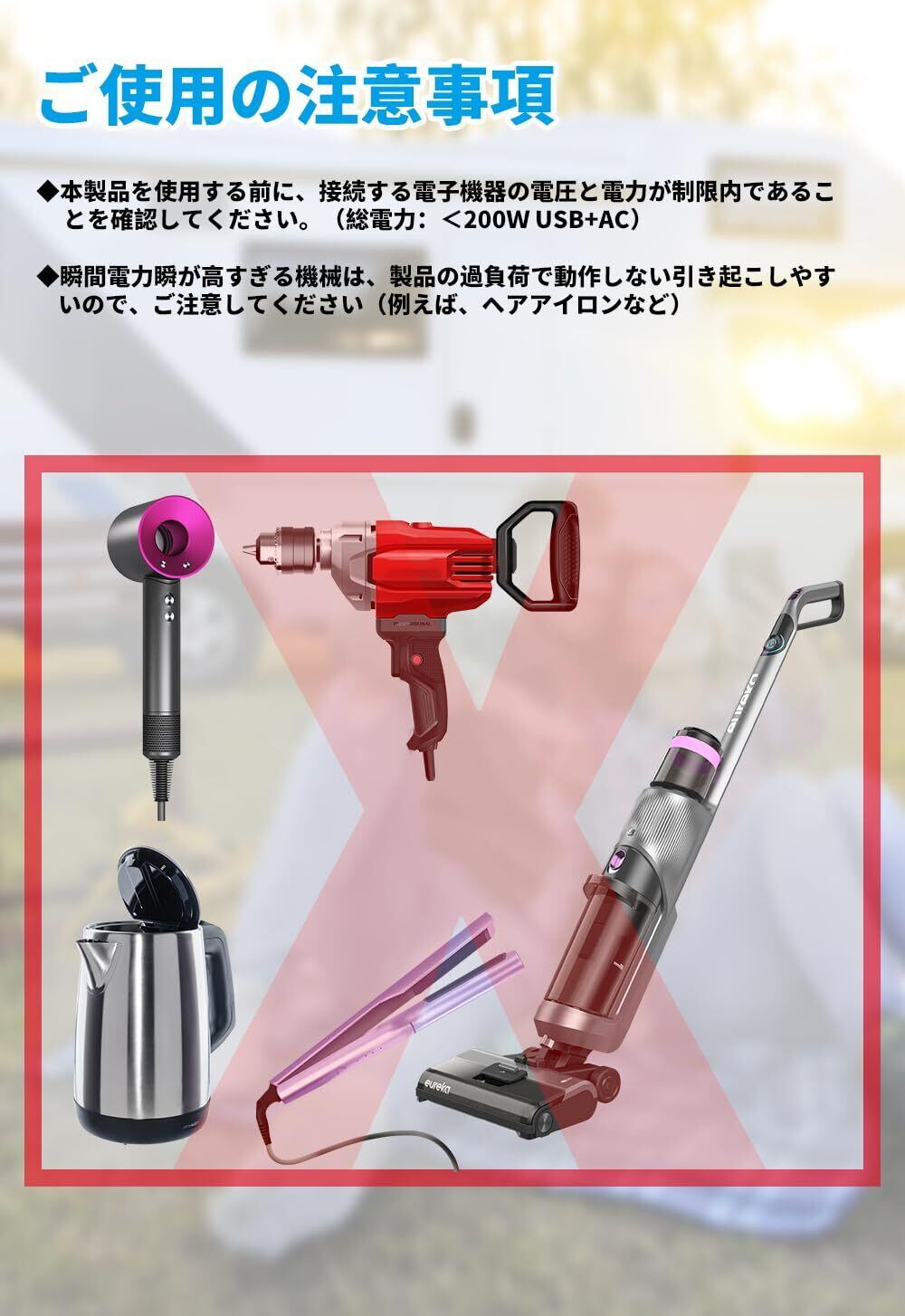 【車でコンセント充電】日本仕様・200W インバーター はACコンセント口2つとUSB口が4つあります。USB口は2*USB-A(QC3.0)+2*PD18W(MAX)となっています。車で複数の電気用品を同時に充電/使用することができます。type-cポートがあり、プラグいらずiPhone 15の充電が可能です。旅行などの長距離移動の際に電源切れの悩みがありません。●車載用インバーター の定格出力は200W(USB出力+AC100V出力)です。必ず使用機器の消費電力を合計が200W以下でご使用ください。●お車のシガーライターの最大消費電力も超えないでください。