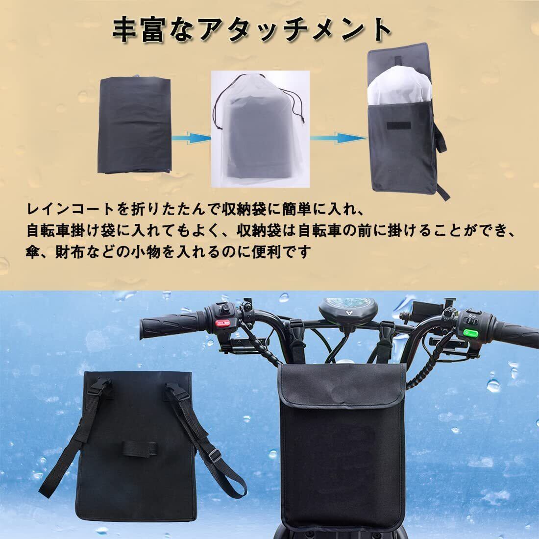 持ち運びや収納が簡単なレインポンチョ:Facecozyの自転車用レインコートには、レインコートの収納袋と自転車用の前置きポータブルハンギングバッグが付属しています。レインコートを簡単に折り畳んで収納袋に入れることができ、自転車用のハンギングバッグと組み合わせて自転車の前に簡単に取り付けることができます。自転車用ハンギングバッグには、傘、ハンドバッグなどのさまざまな小物を収納することができます。Facecozyレインポンチョは、通勤や通学、保育園、幼稚園の送迎、スポーツ観戦、お散歩、自転車、アウトドア、釣り、作業、登山、ゴルフ、除雪作業など、様々なシーンで活躍します。