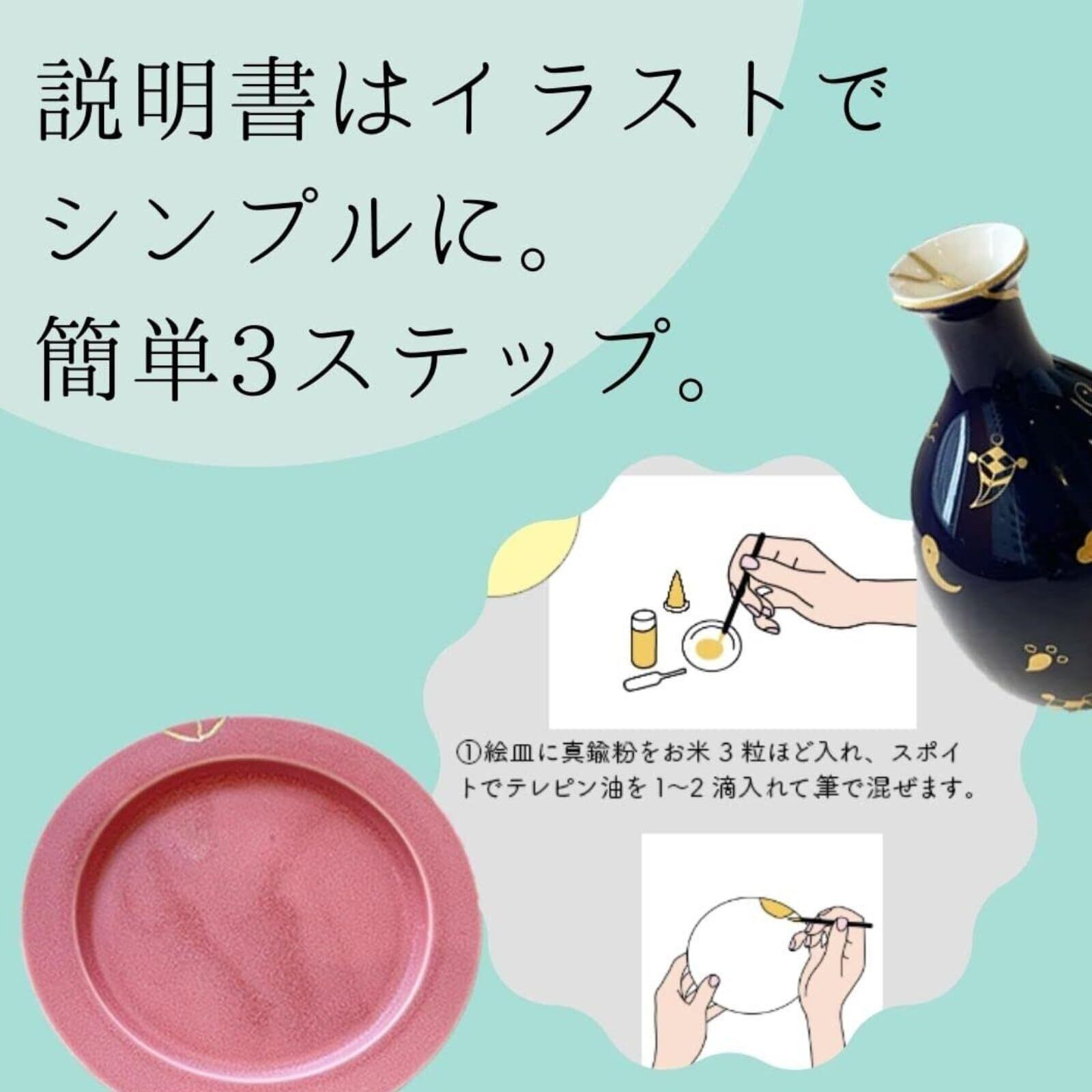 【セット内容】説明書、金粉(真鍮粉)、エポキシ接着剤、エポキシパテ、簡易面相筆・簡易平筆、絵皿、耐水性紙やすり# 400、テレピン油、合成樹脂、金継ぎに必要な材料が全て揃ったセットになっております。