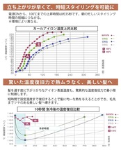商品特長 自由自在にカールを作る/立ち上がりが早い/100℃~220℃ 25段階温度調節可能/全髪質対応/セラミックコーディング加工/AC100-240V対応 海外対応