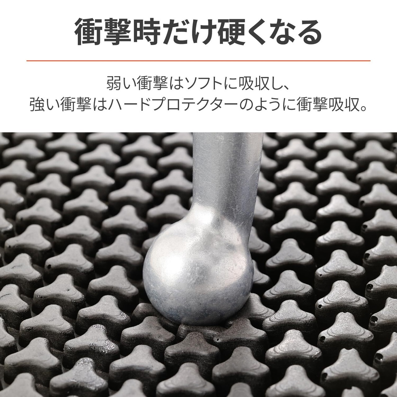 衝撃が加わったときに瞬間硬化する特殊な発泡ウレタン。弱い衝撃時はソフトに吸収、強い衝撃時には硬く吸収