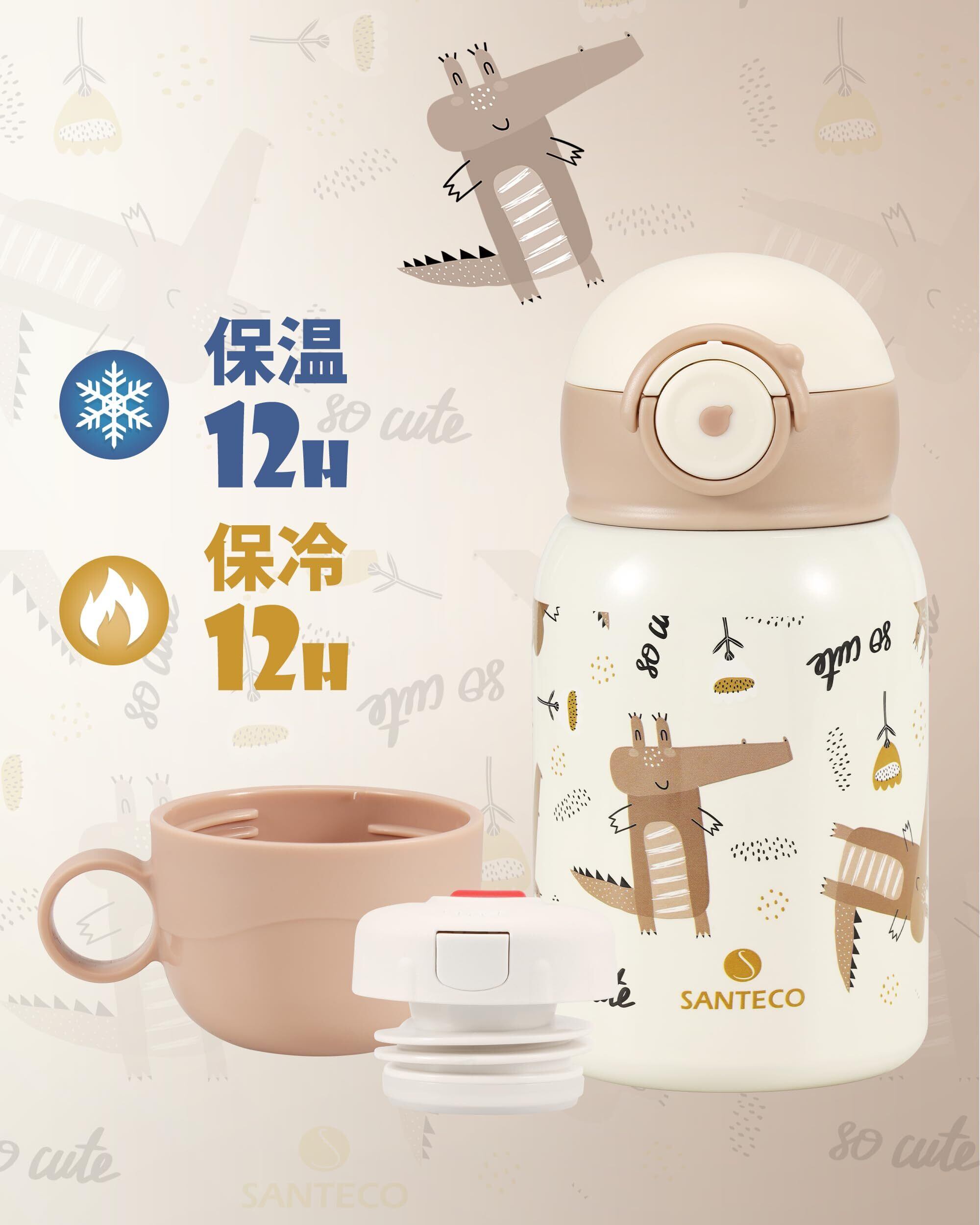 SANTECO 水筒 MARA 魔法瓶 450ML 子供用 ストロー付き 直飲み 2Wayタイプ スポーツドリンク対応 炭酸対応 保冷 保温 真空断熱 広口 316ステンレススチール おしゃれ 可愛い 子ども 小学生 キッズ 男の子 女の子 クロコダイル (カーキ)