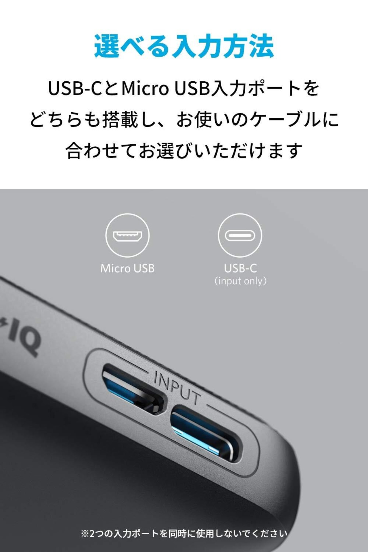 選べる入力方法:本製品の充電のために、USB-CとMicro USB入力ポートをどちらも搭載し、お使いのケーブルに合わせてお選びいただけます(※2つの入力ポートを同時に使用しないでください)。