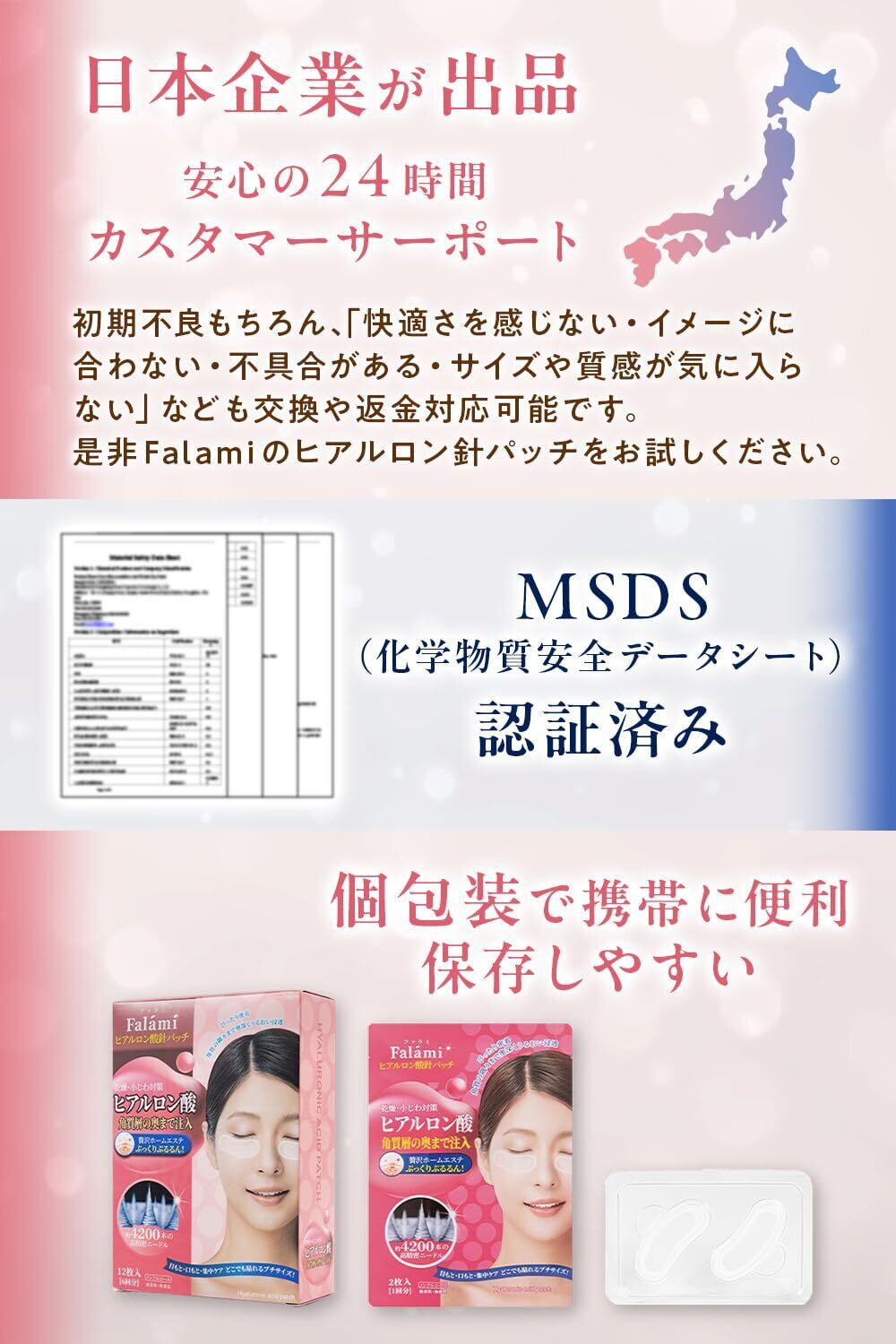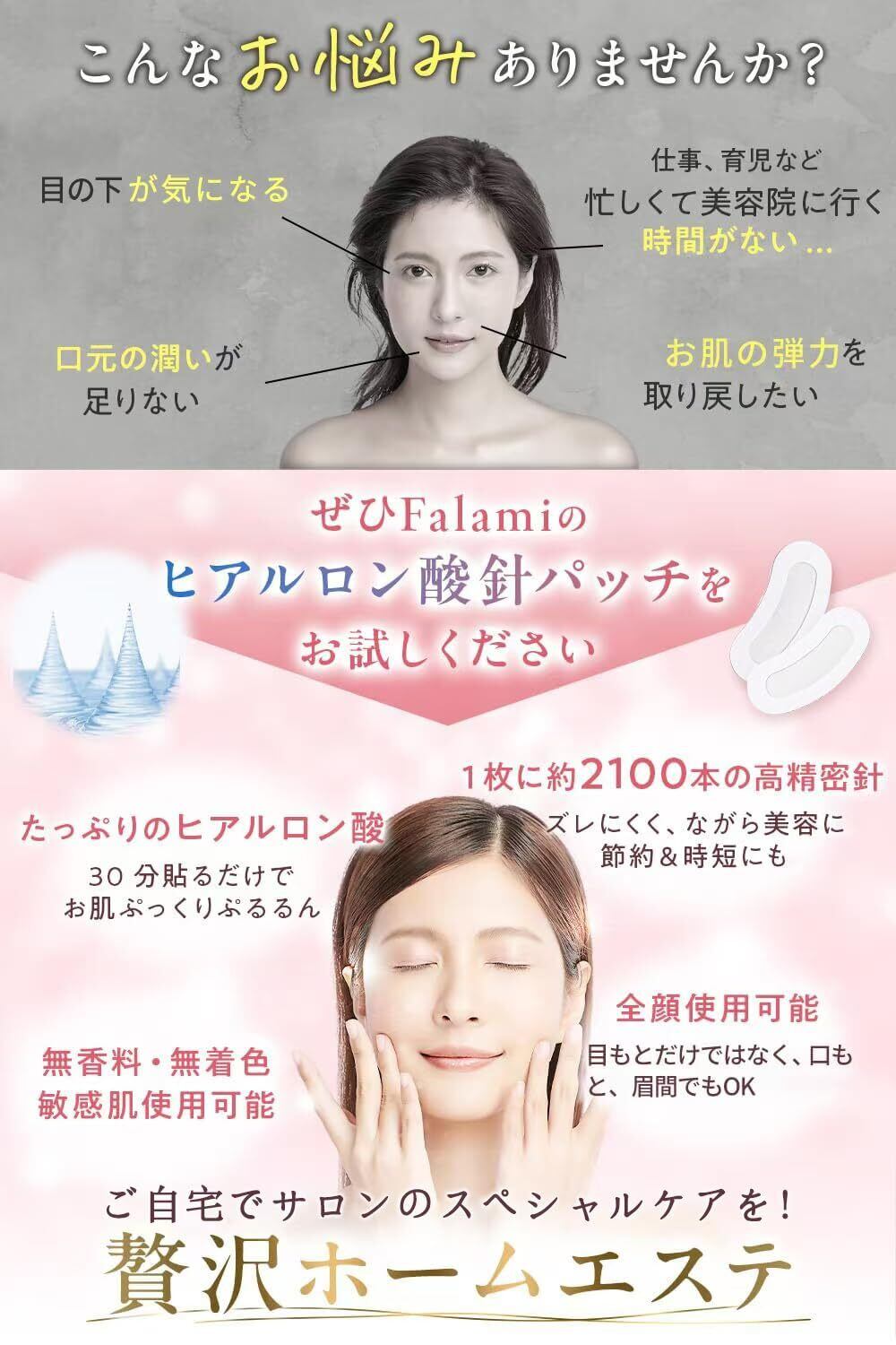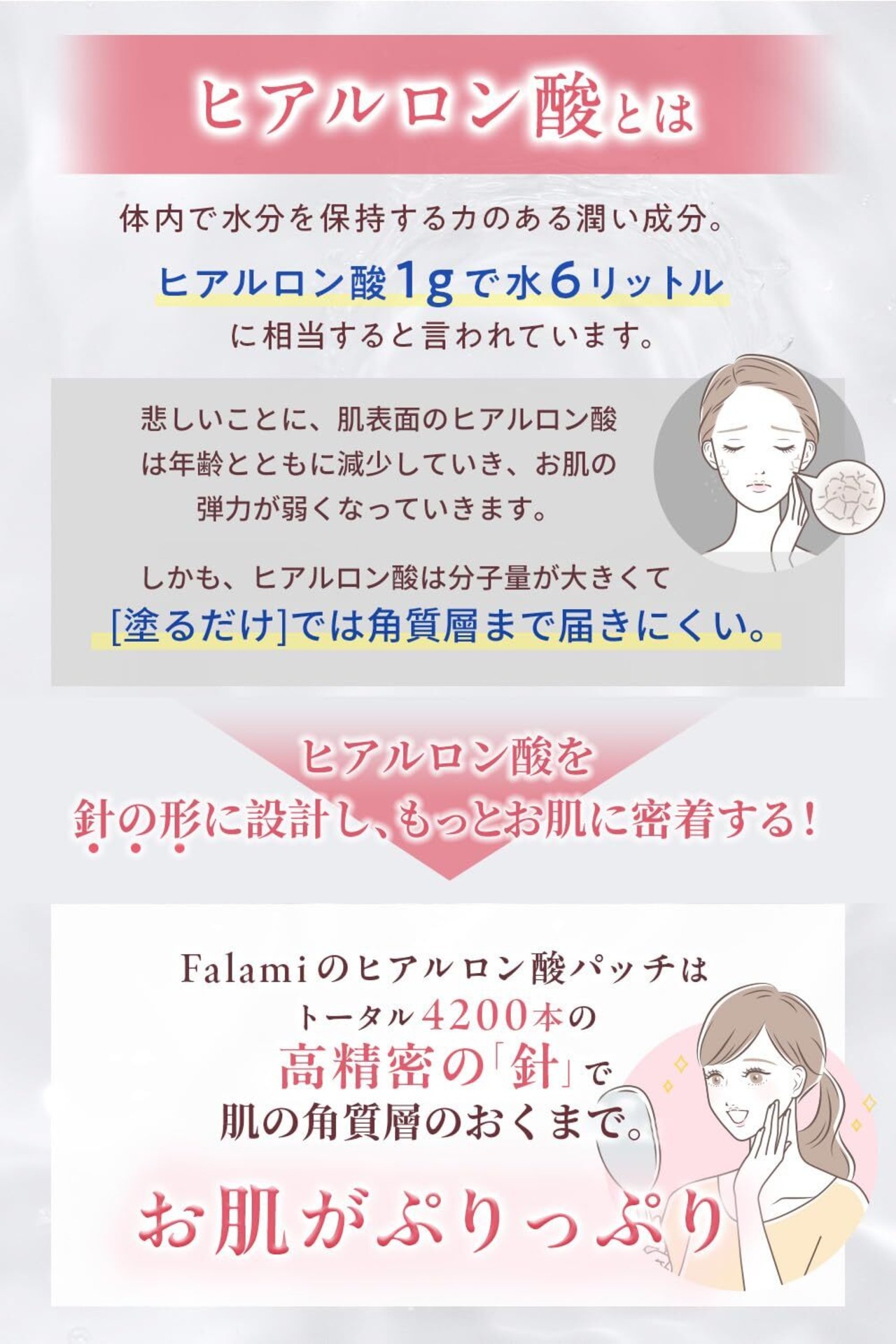 【大きめサイズのマイクロニードルパッチ】 マイクロニードルパッチには円形や楕円形のものがありますが、楕円形は目元・口元・おでこなど広範囲のケアに最適です。Falamiのパッチは楕円形で、1枚のシートで目元やほうれい線などを広範囲にカバーすることができます。(サイズ:4.5×1.5cm) 【寝返りしても剥がれにくい】1パックに約4200本の針があり、肌にしっかり密着します。そのため、寝返りをしても剥がれにくく、パッチの推奨使用時間を守れます。