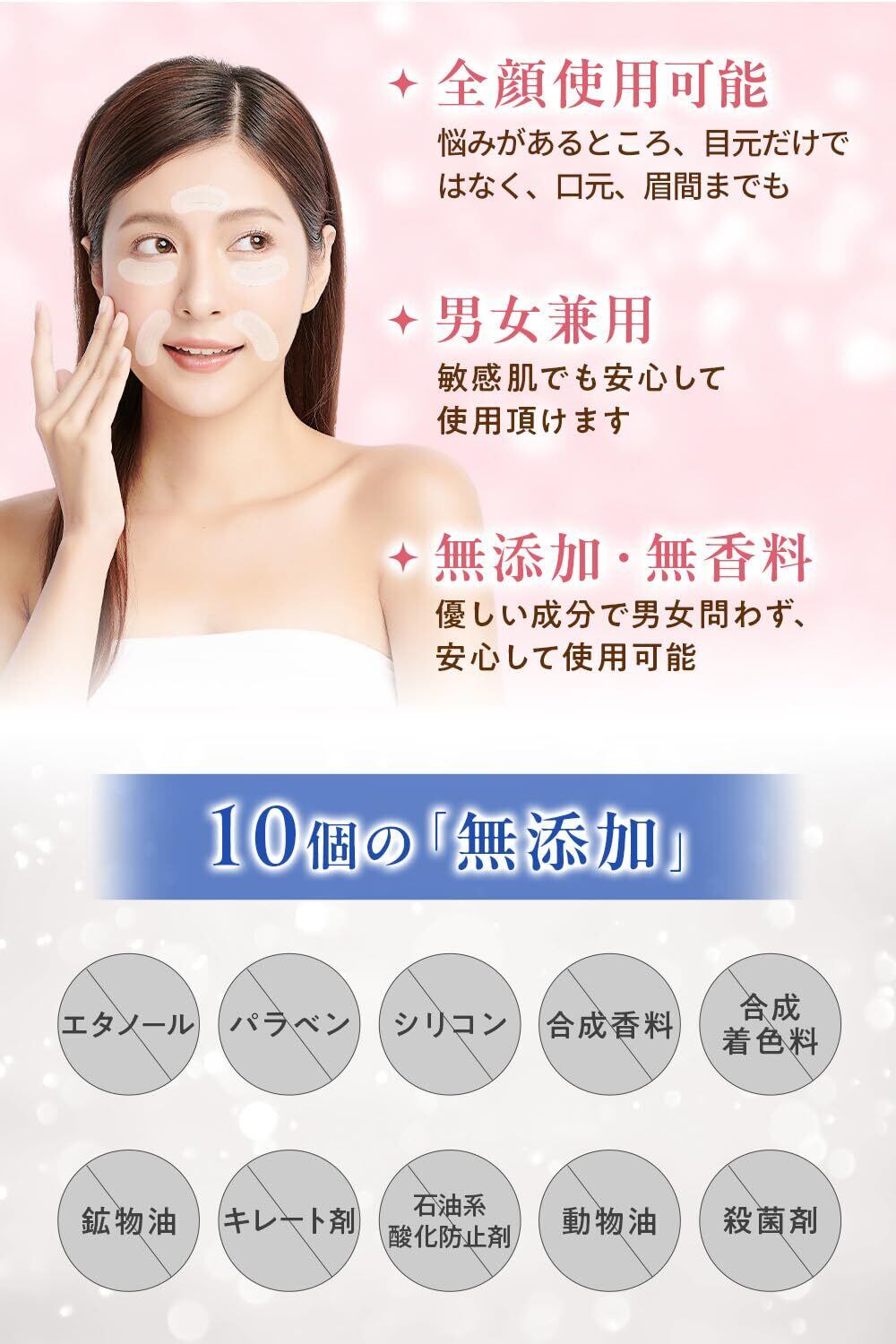 【日本企業企画・日本語サポート】使用にご不快があればお気軽に弊社までご連絡ください。ご連絡方法:ご購入履歴から製品画面を開く=>右側(カート)の下方に[販売元]後ろの会社名をクリックする=>新画面の右上に[質問する]ボタンをクリックする。●ご使用方法:1.就寝前の洗顔後に化粧水や乳液を使って肌を整えます。2.フィルムからパッチをはがして目元や口元お気になる部分に貼り付けます。3.パッチを貼ったまま就寝します(5時間以上お薦めます。時間が少ないと針状のヒアルロン酸が溶けない可能性があり)