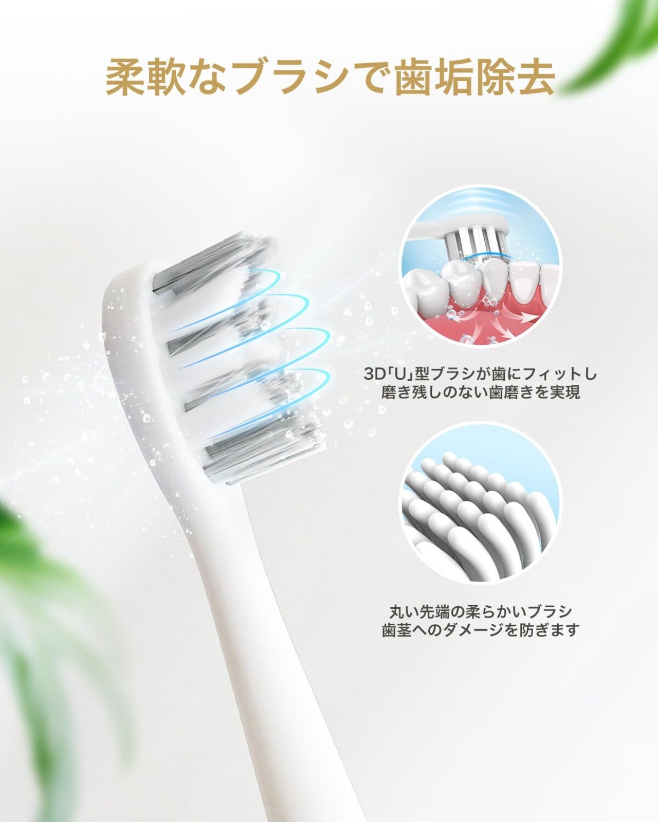 【特徴】振動によって短時間で効率的に汚れを落とし、歯と歯茎を的確にケアします。 先端が丸いブラシを採用しているため、歯茎を傷めることなく優しく歯を磨くことができます。