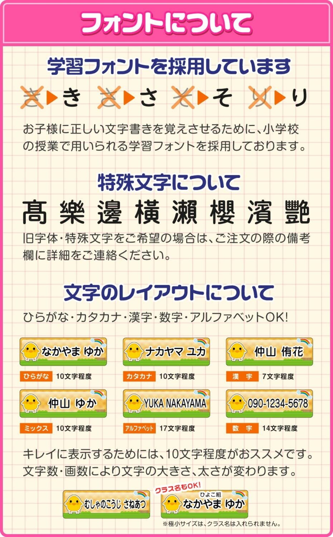 【ご注文にあたってのご注意点】特殊文字(旧字・特殊文字)をご希望の場合には、ご注文の際のメッセージに詳細をご連絡ください。レイアウトはひらがな・カタカナ・漢字・数字・アルファベットが可能です。キレイに表示するためには、文字は10文字程度がおすすめです。文字数・画数により文字の大きさ、太さが変わる場合がございます。