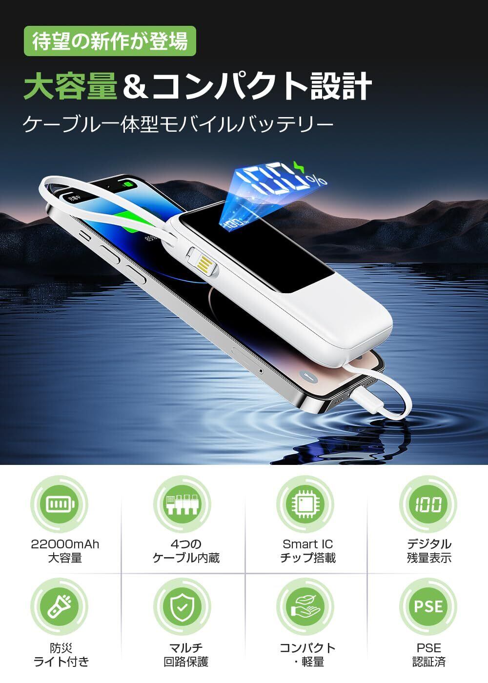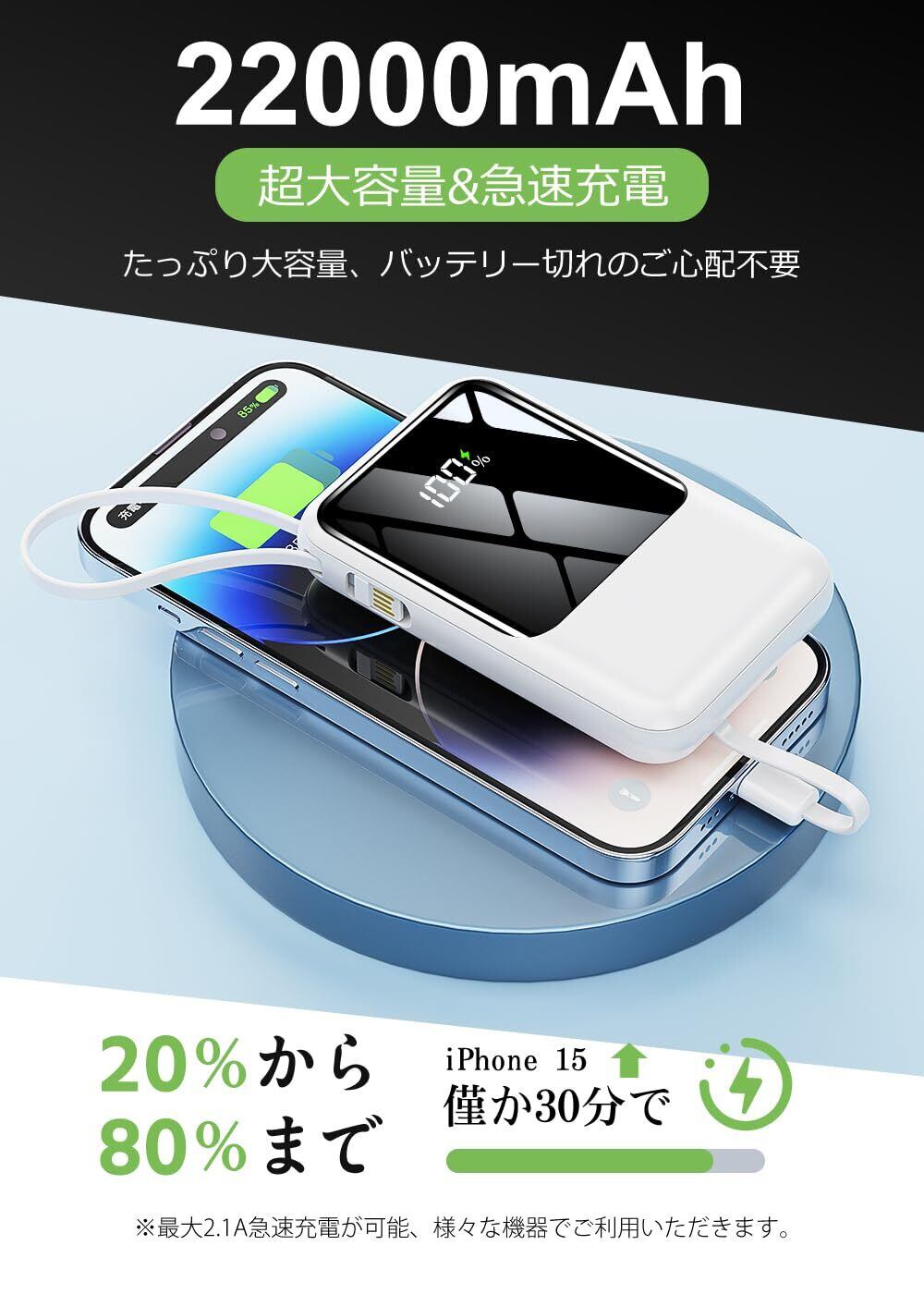 【特価セール】モバイルバッテリー 大容量 22000mAh 【230g軽量化・4つのケーブル内蔵】モバイルバッテリー 軽量 小型 急速充電 4台同時充電 残量ディスプレイ搭載 PSE技術基準適合品 LED照明ライト マルチ安全回路保護 タイプC入力ポート&USB-A出力ポート 4種類ケーブル内蔵 携帯充電器 スマホ充電器 コンパクト&軽量 機内持ち込み可能 旅行/出張/アウトドア/停電/防災緊急用 白い