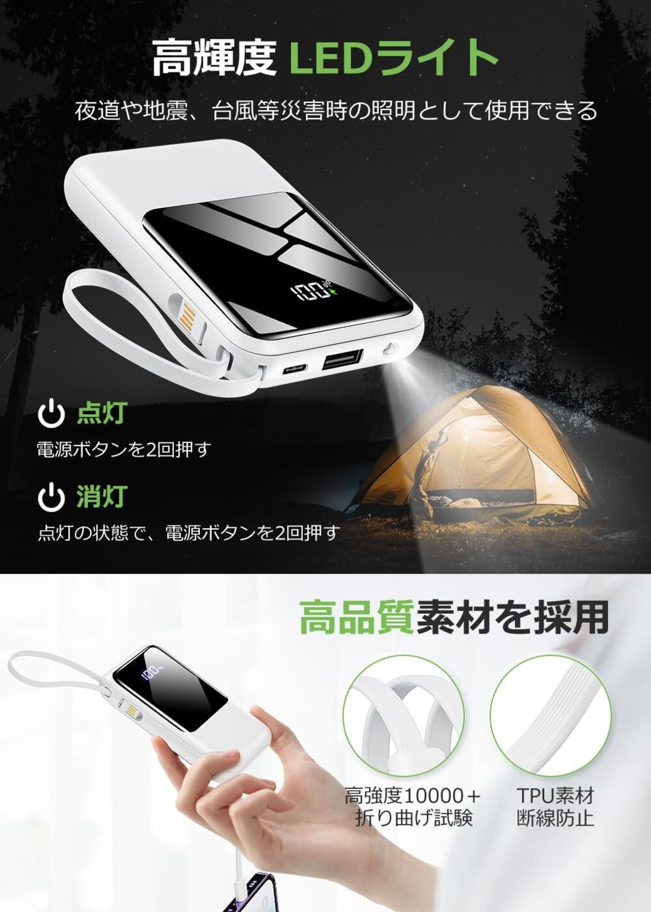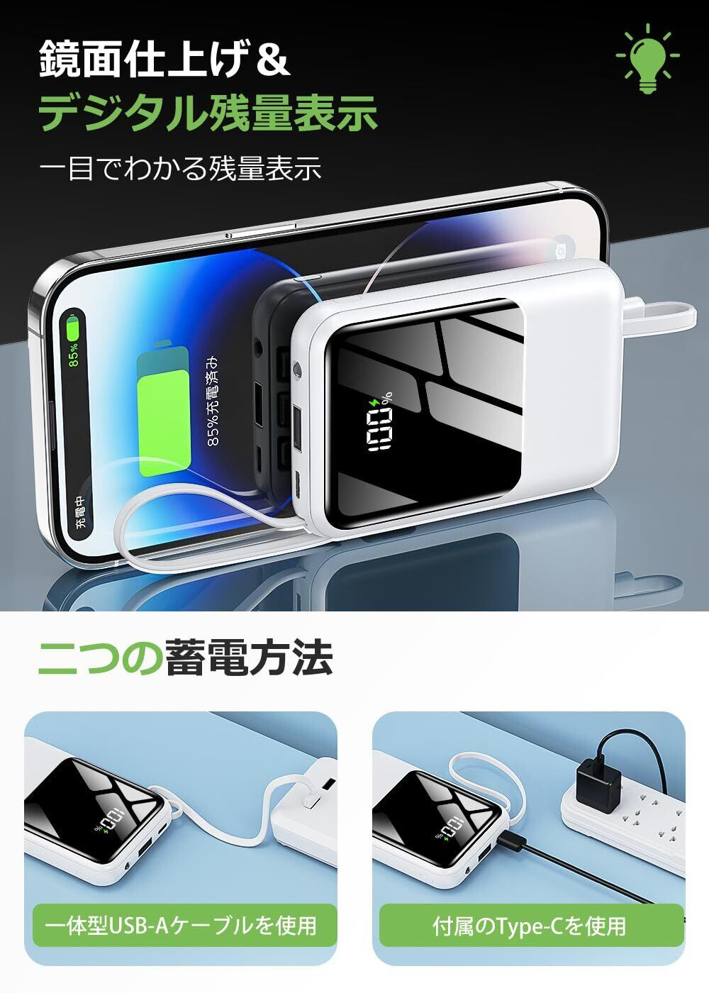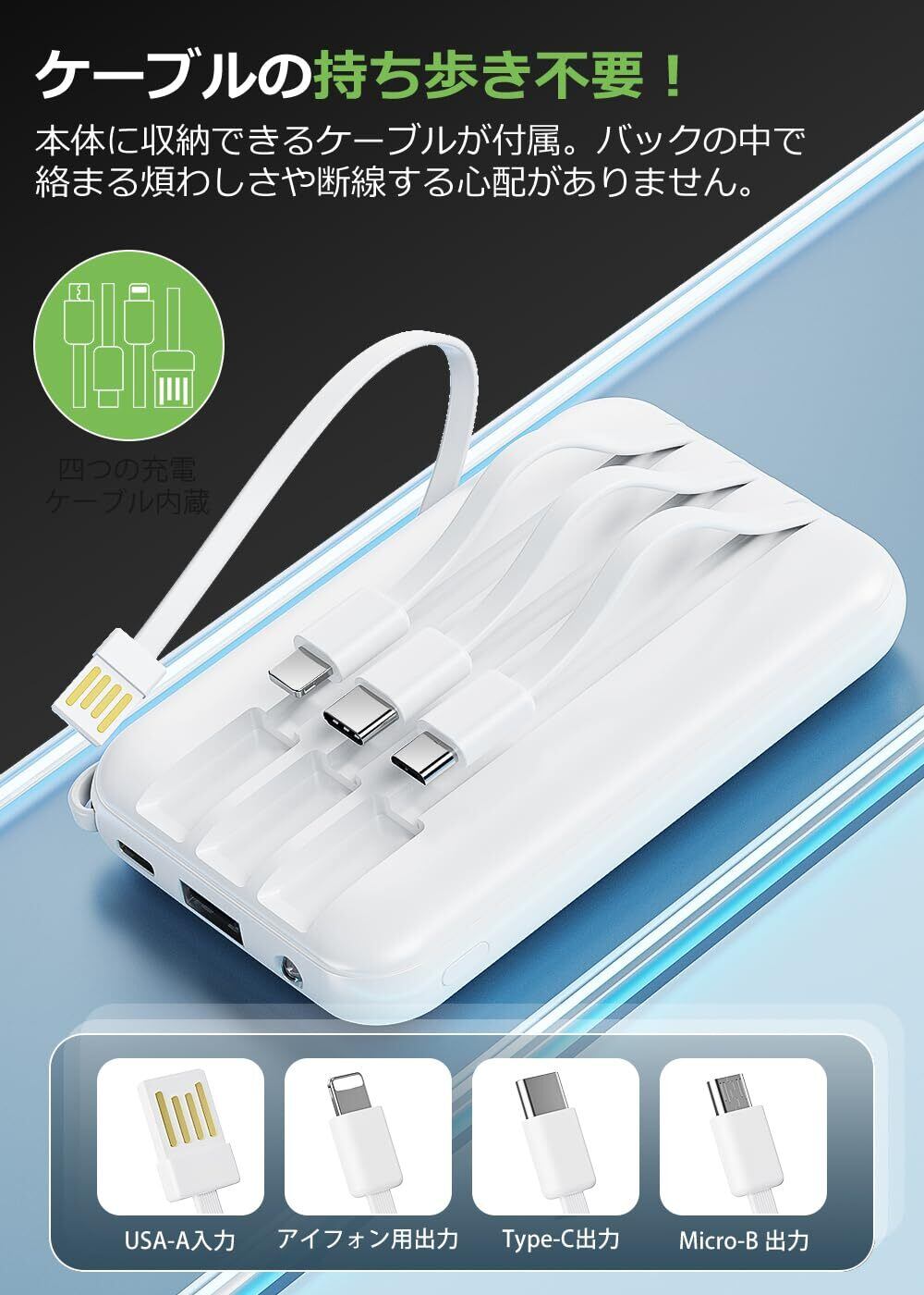【急速充電可能なポート・4種類ケーブル内蔵】最大2.1Aで急速充電可能USB-A出力ポートを搭載することで、通常の5W出力に比べ2倍以上の速度で充電することができます。USB-A出力ポートと端子の異なる3種類(タイプ-C出力、アイフォン向け出力、micro USB出力)のケーブルが内蔵されており、最大4台のデバイスの同時充電が可能、コンセントのない場所でも手軽に充電できるため、安心して出かけることが可能。畜電可能な充電ケーブル(USB-A入力)を内蔵することで、別途充電ケーブルを持ち運ぶ必要がなく持ち物を少なくし簡単に充電することが可能で、完全なケーブルレスを実現。ケーブルを忘れたときも充電ができないなんて心配はありません。または、本体にケーブルがすっきりと収納できるので、カバンの中でケーブルが絡まったり断線することを防ぎます。