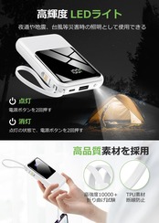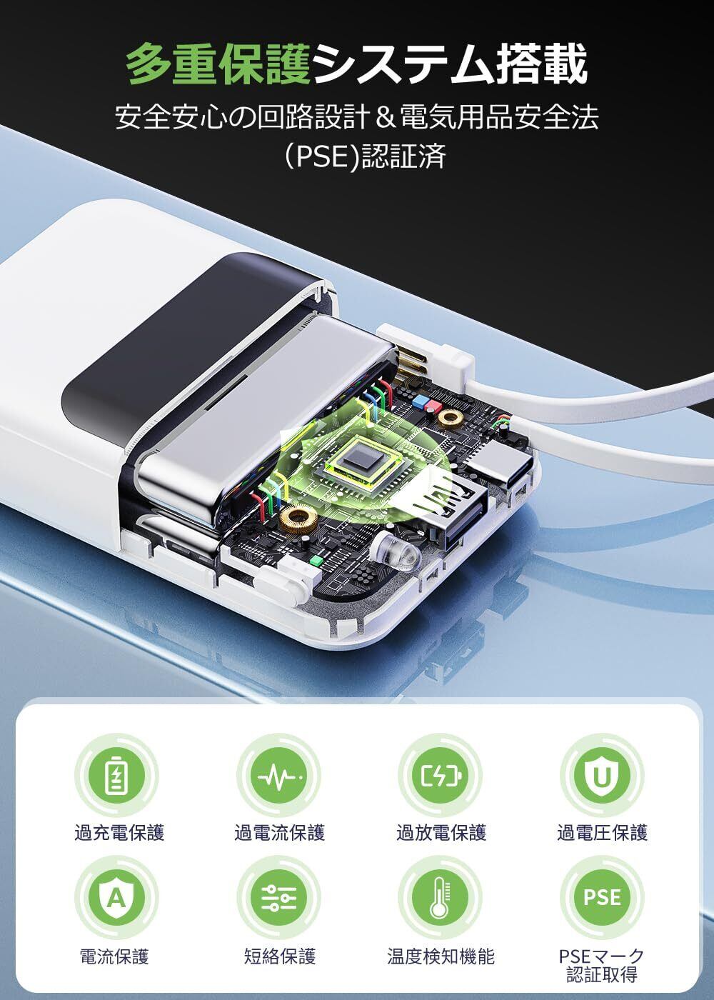 【安全に使える、安心設計】①日本の電気用品安全法(PSE)お技術基準に合格した安全性の高いモバイルバッテリーです。②温度検知センサーによる加熱保護機能を搭載③過電流・短絡・過充電・過放電等の各種保護機能を搭載、過電流・過電圧・短絡(ショート)発生時に出力電流を停止します。④ボディには汚れ・キズを抑える表面加工が施されているほか、高グレードの厳格に試験されたバッテリーと耐久性の高い難燃性筐体ケースを採用しています。火災、衝撃、落下に対して高い耐性を備え、安全性を確保しつつ、熱によるバッテリーの劣化を抑えられます。【防災用LEDライト付】被災時などに光源として利用できるLEDライトも付いているので、アウトドアなどで周囲を照らせるほか、停電や災害等非常時にとても便利で役立ちます。【パッケージ内容】22000mAh モバイルバッテリー+充電用Type-Cケーブル+日本語説明書。